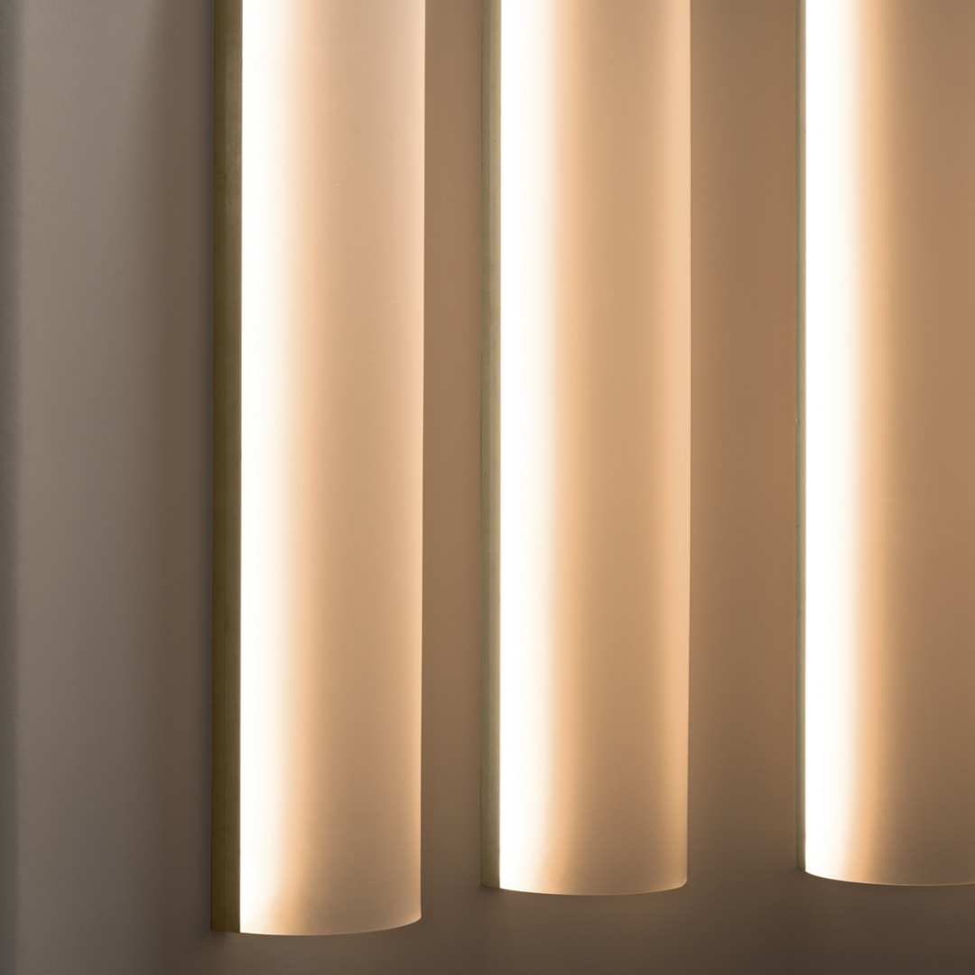 8 mm thick lampshade in printed curved methacrylate. Profiles and details in satin brass-coated metal with matte varnish. Lamp with 2700K led light source.
