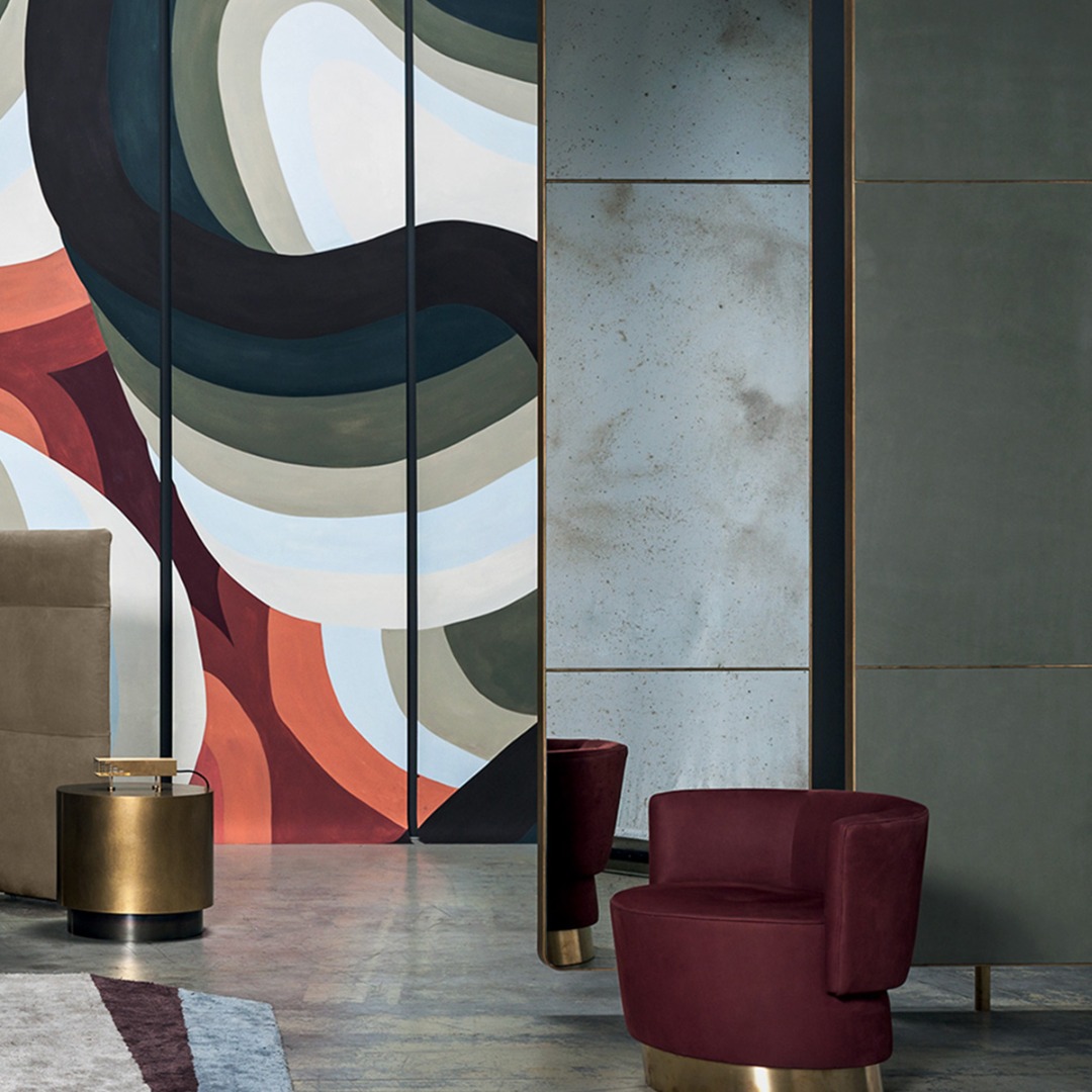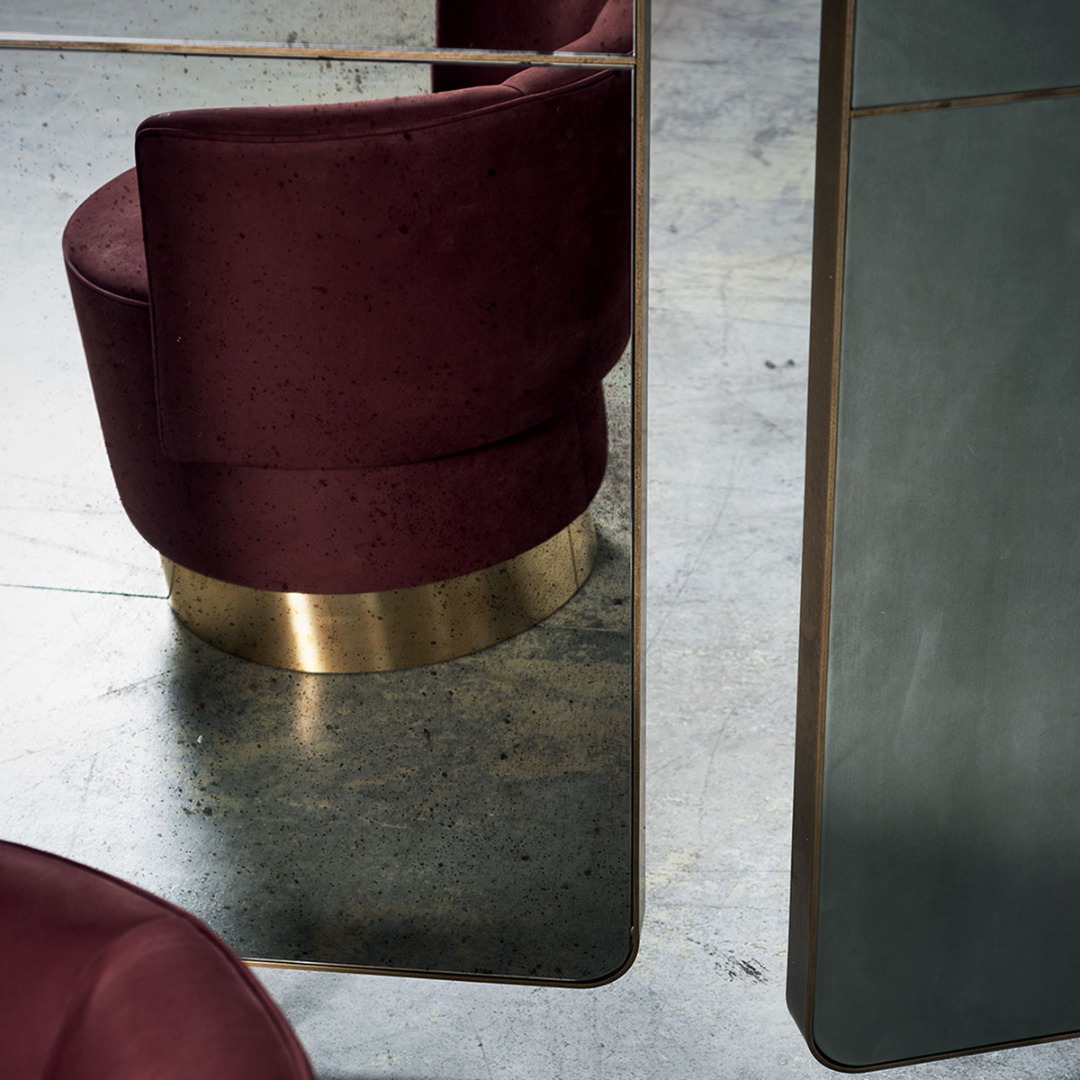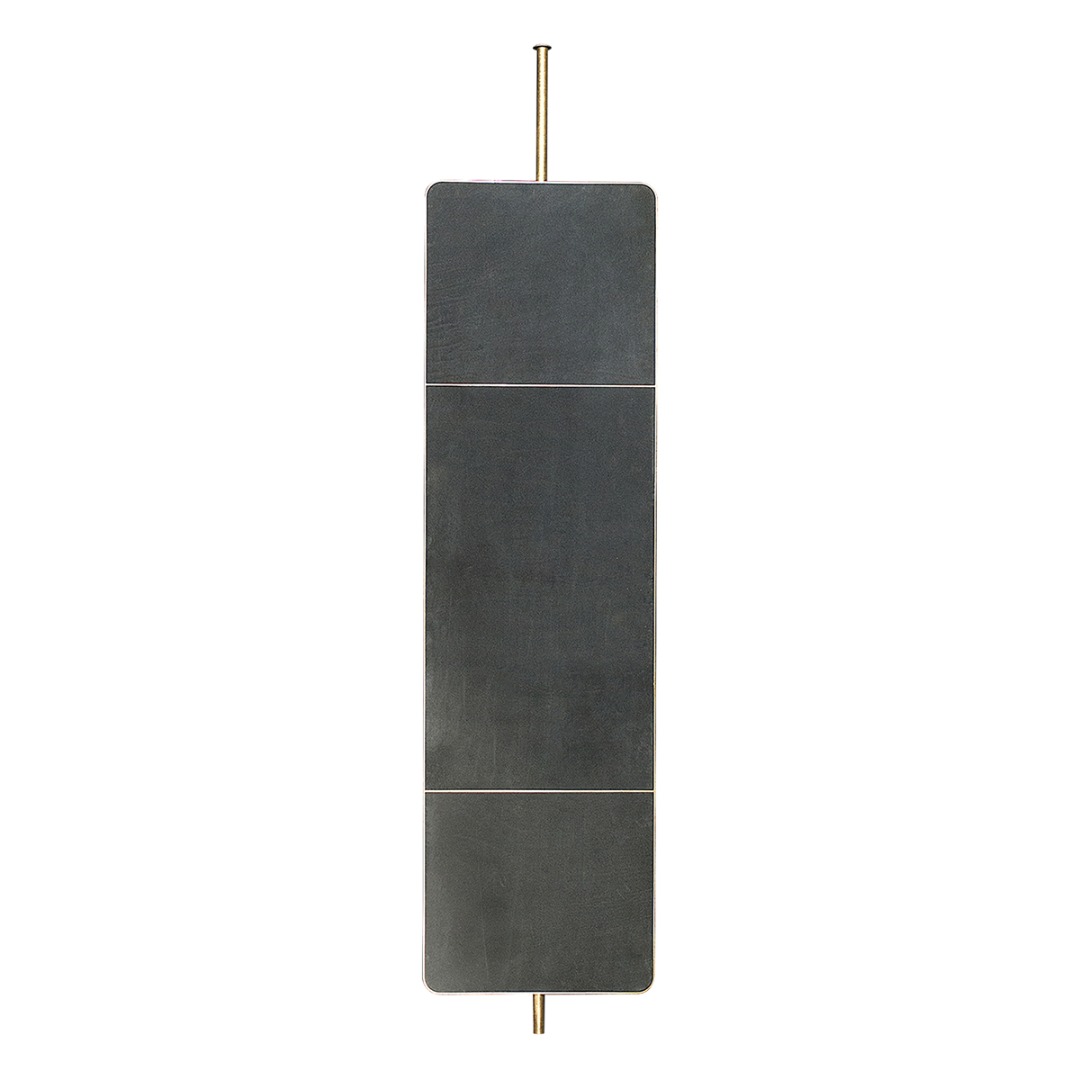 Two-faced screen with revolving structure in antiqued brass, consisting of one side in antiqued mirror and one with leather covering.