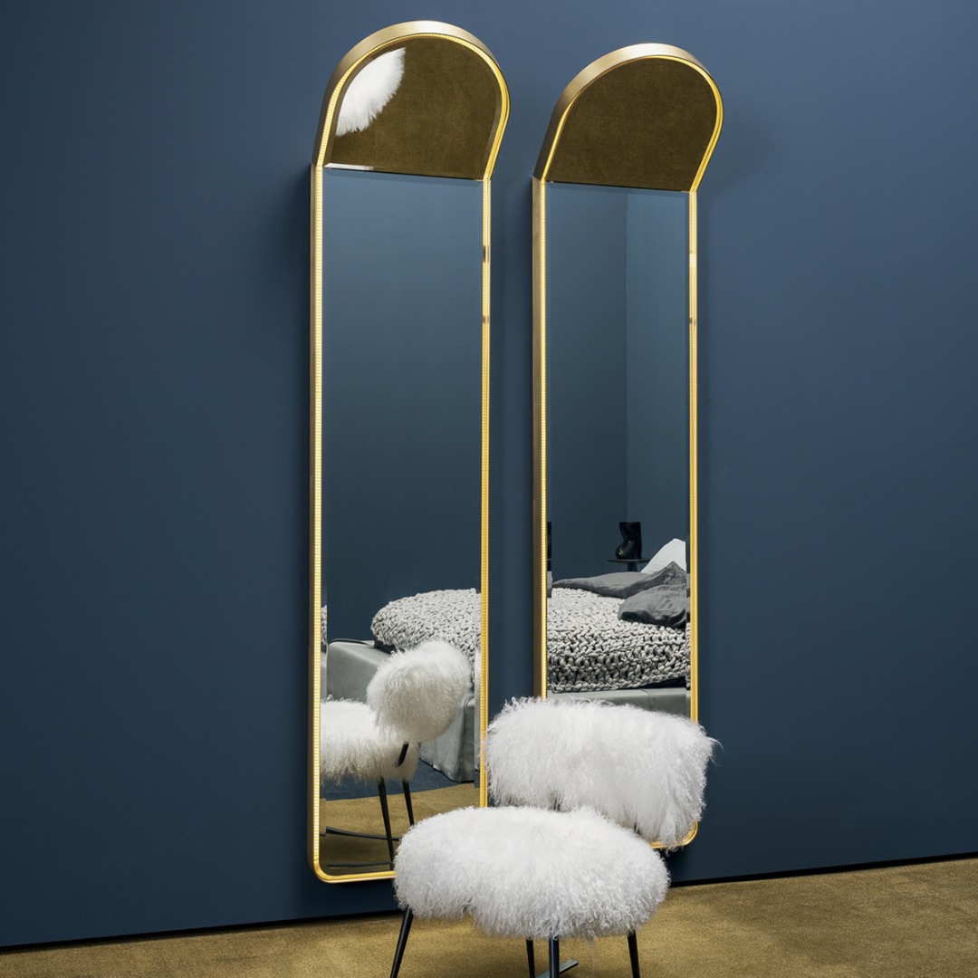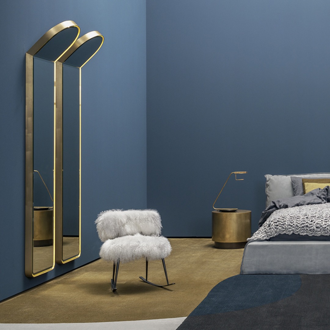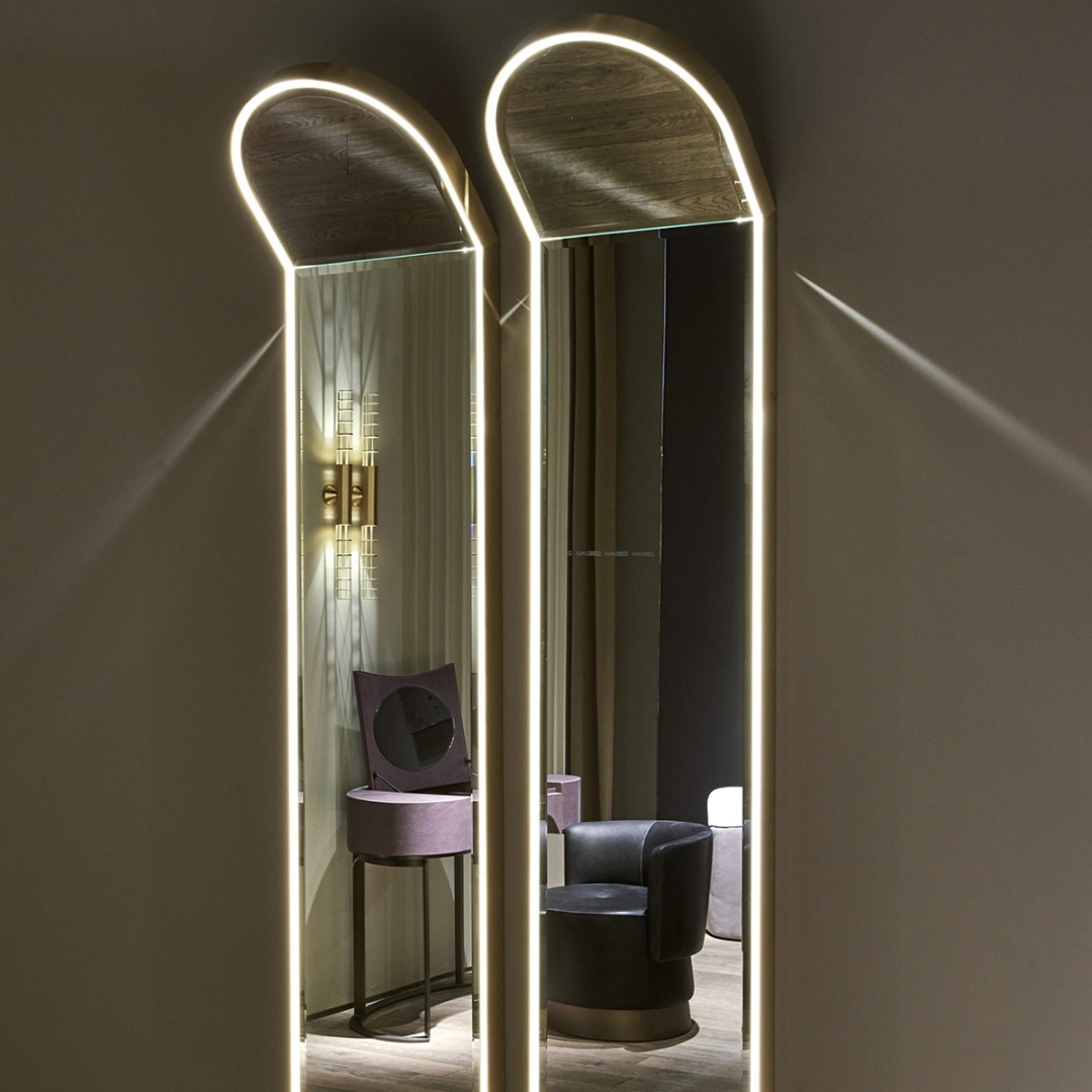Structure in black paste-dyed MDF. Satin-finished brass frame with inner led lighting. 3000K LED strip - 3600 lumens.