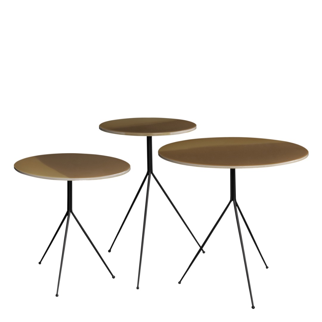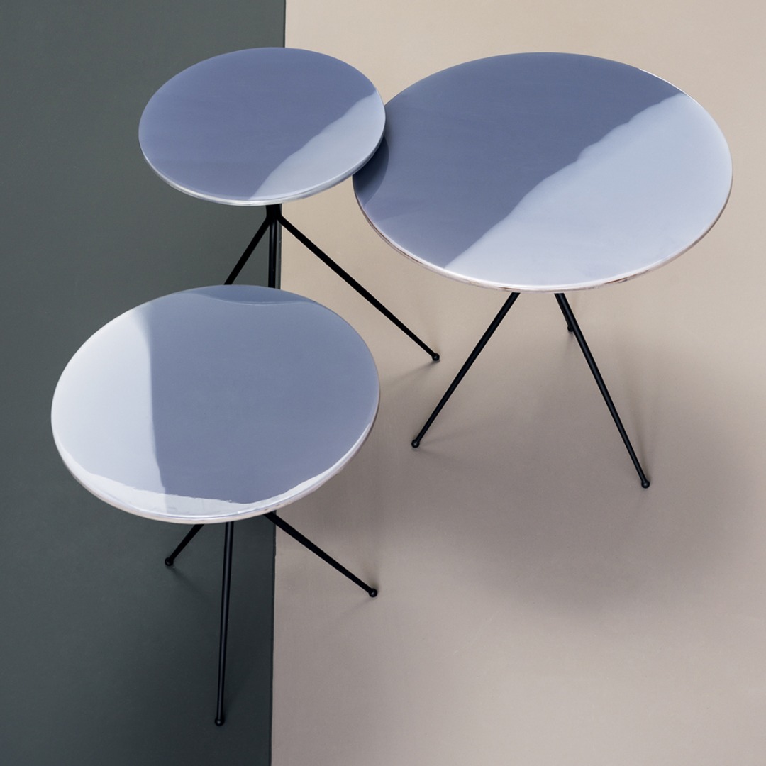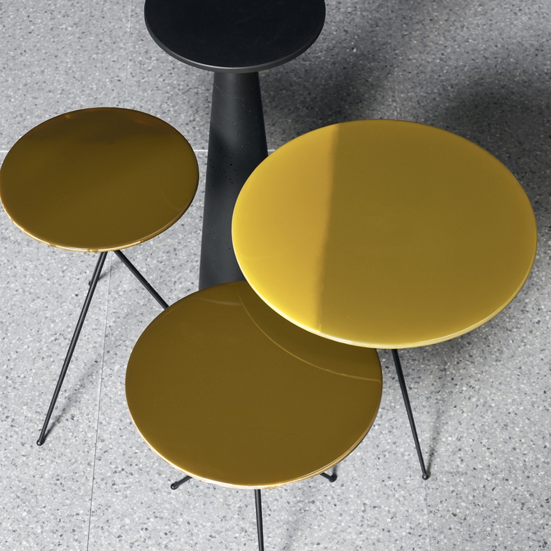 Matte black-varnished metal base. Smoothed resin top, decorated by hand with nuance and texture in line with the artist’s creativity. Surfaces finished by hand so each item will be different and unique.