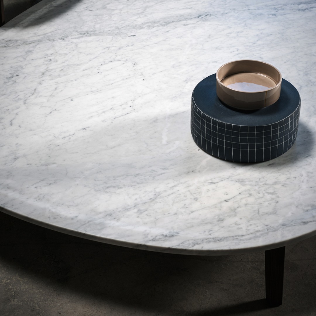 Base in brushed walnut-stained ash. Top in matte Bianco Gioia marble with water-repellent protective oil, shaped, 2 cm, thickness with 0.5 cm, hod lowering and external flaring.