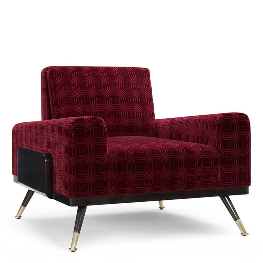 Upholstered back and wood legs with metal sleeve in Bristol Brass finish. Available in either Camden Rosewood or Peckham Dark Ash.