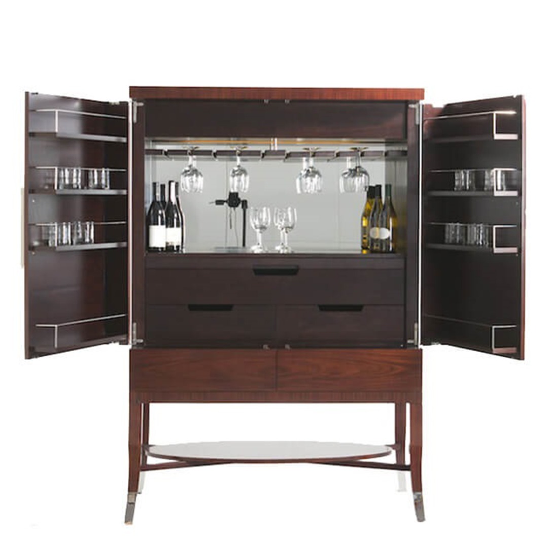 Bar Cabinet in Engineered rosewood veneer with zinc alloy handled. Interior bar cabinet with mirrored back, LED lighting, wine glass and drawer storage.