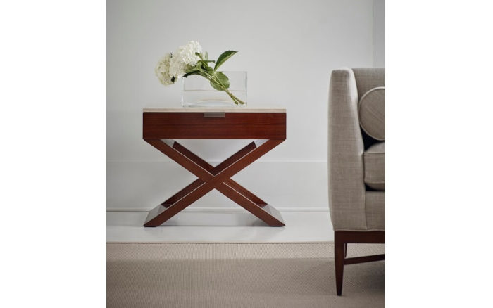Walnut veneer base with Travertine marble top and dark bronze powder coat accents. One mitered self-closing drawer.