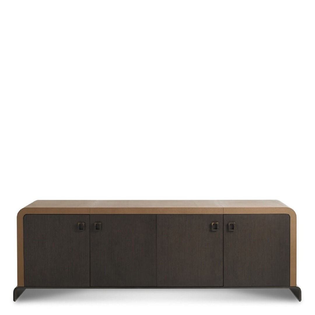 Rift cut oak veneer with leather wrap exterior and bronze base. Shown in 1901 Smoked Oak.