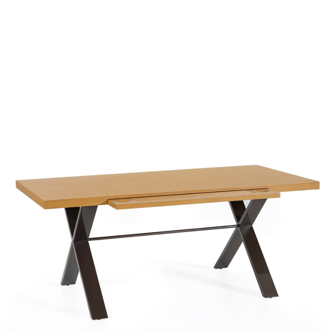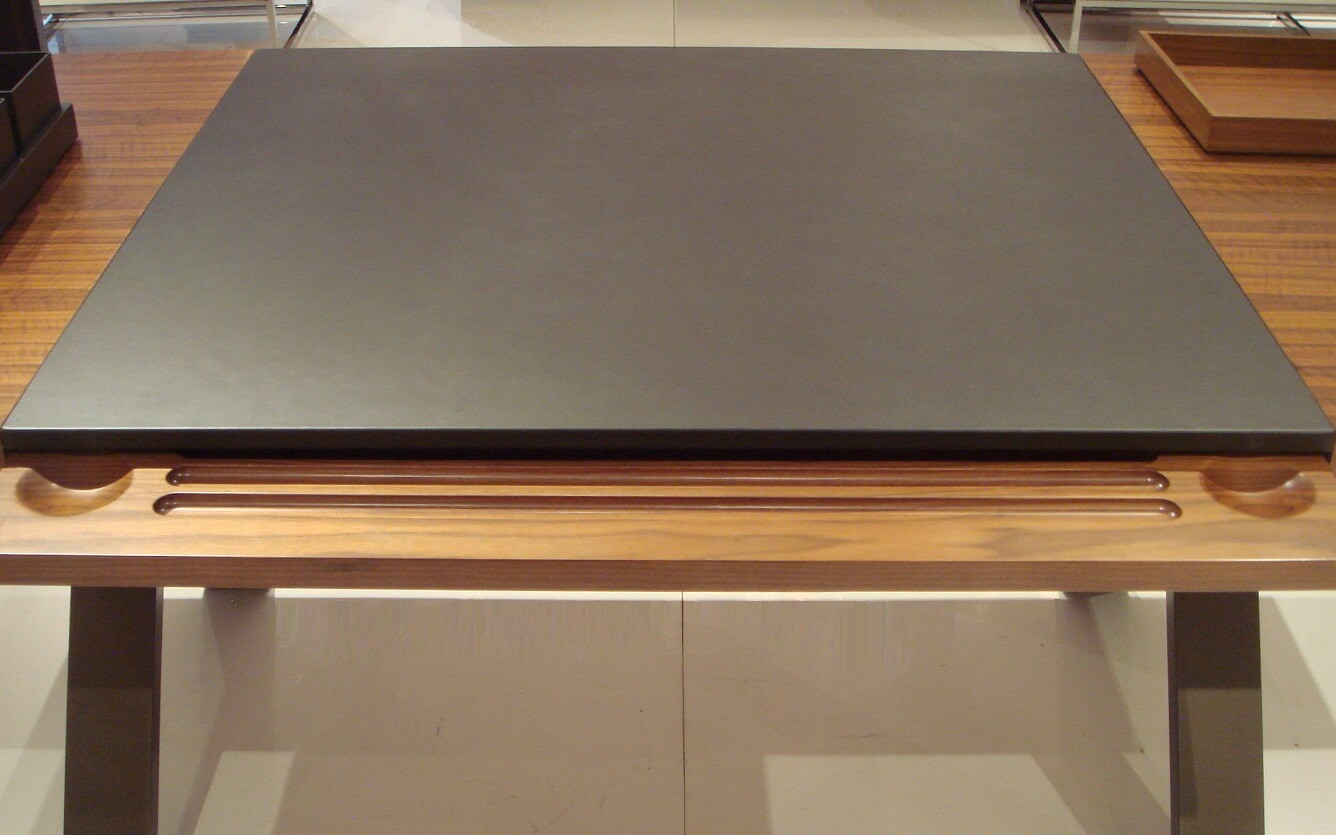 Table in walnut veneer (132002WA) or light oak veneer (132002LO). Bronze powder coat base. Optional: Desk pad (132002P) sold separately.