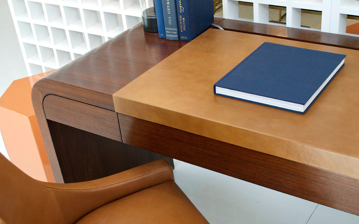 Walnut veneer with dark bronze metal foot-cap. Removable leather desk pad. Hidden power strip. Three self-closing drawers.