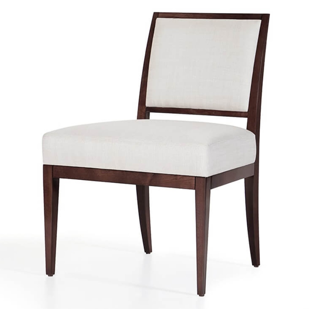 Rosenau upholstered back side chair with Sheridan lattice back in Swirl mahogany and Farbe Lacquer finish as shown.