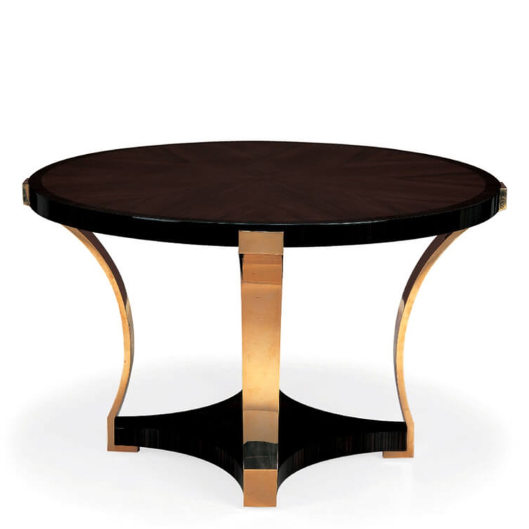 Suitable as 4 seater dining table, or entrance table. Top in starburst Santos engineered rosewood with Macassar Ebony border. Base available in either burnished bronze (45005) or polished brass (45003).