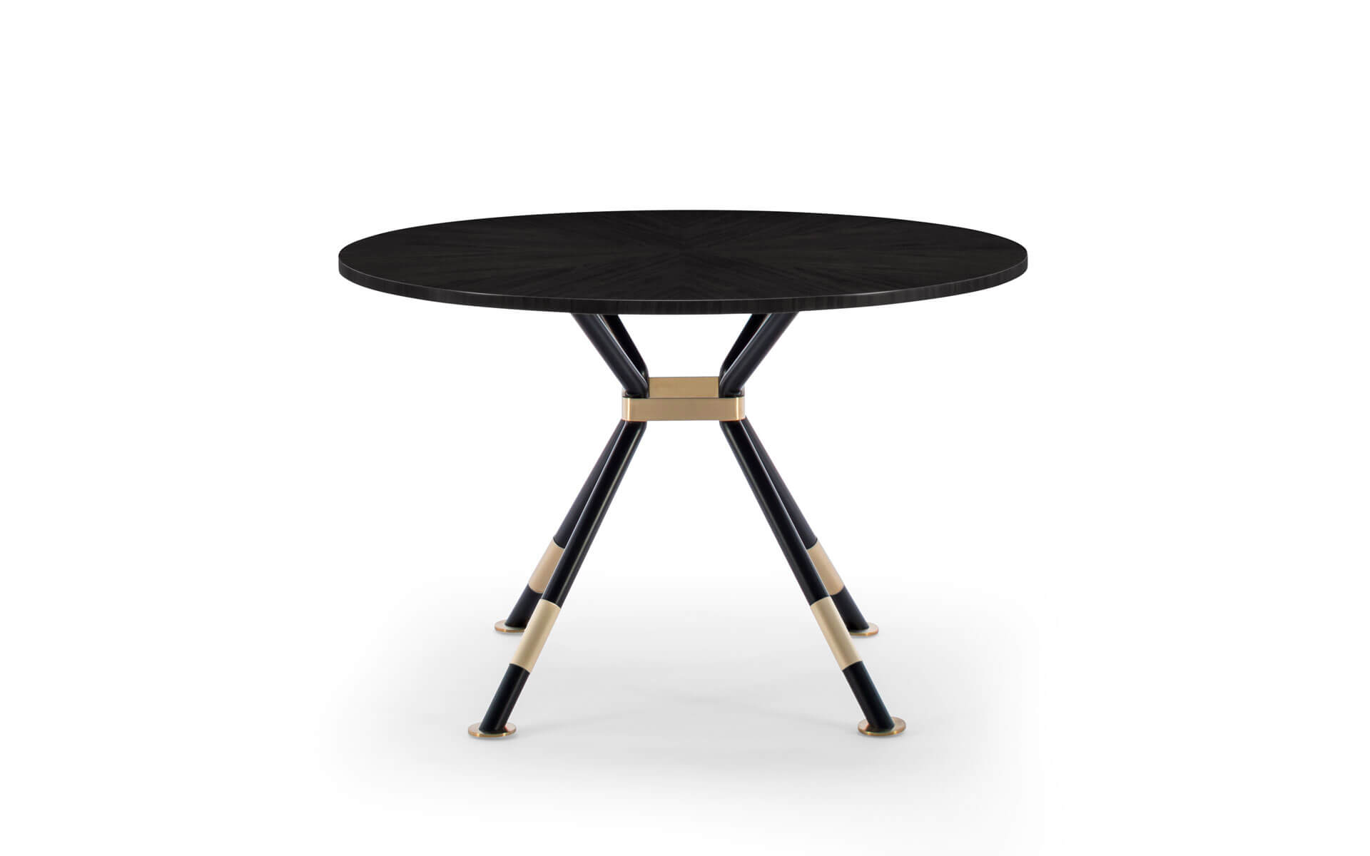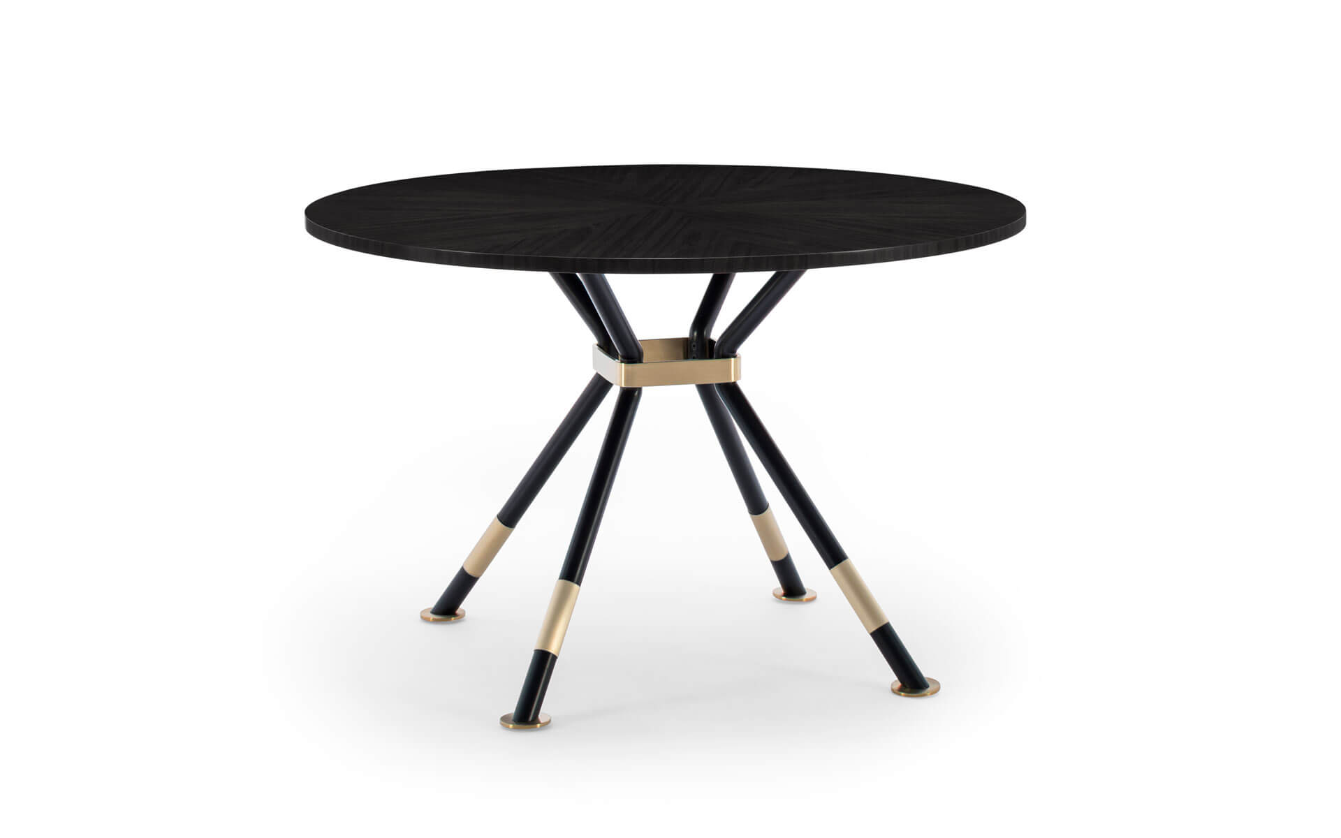Four tubular matte black steel legs with Bristol Brass finish sleeves. Bent steel legs tied together with Bristol Brass finish metal band.