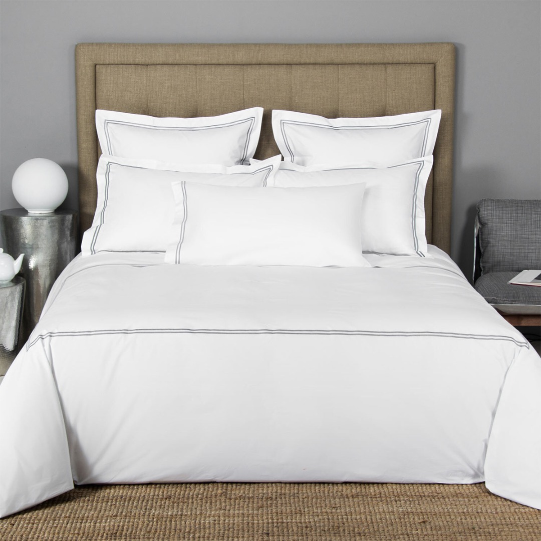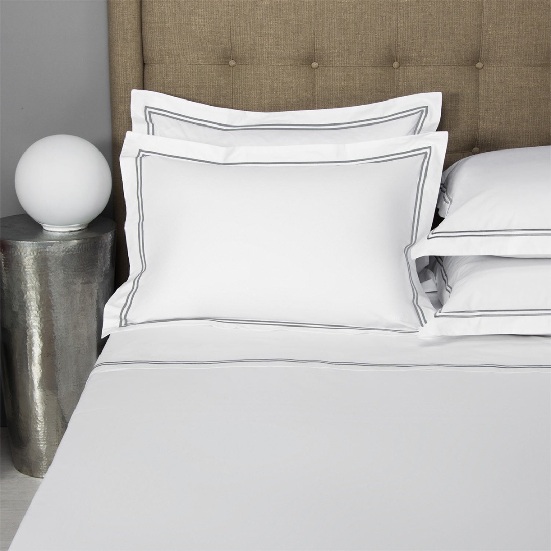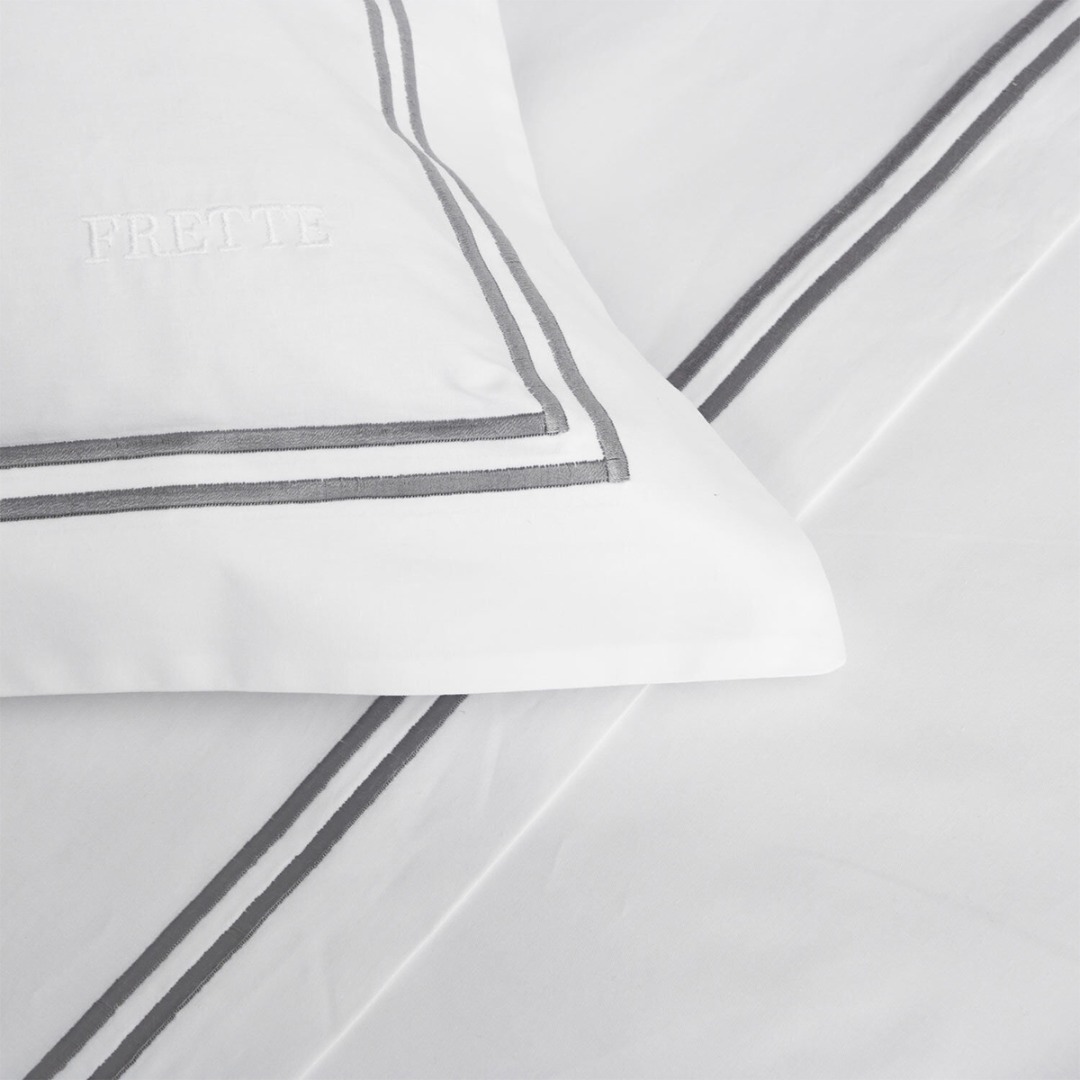 The Hotel Classic Sheet Set from Frette is composed of crisp cotton percale and features a top sheet and pillowcases embroidered with two distinctive borders. Subtle colours effortlessly complement every bedroom interior.