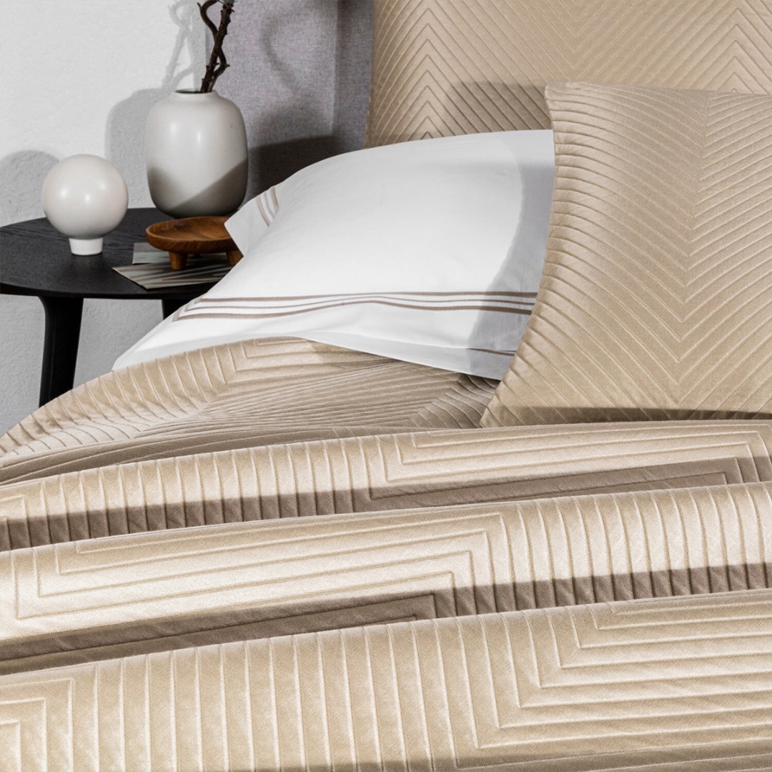 Crafted from a yarn-dyed silk jacquard blend fabric, the elegant Luxury Herringbone Bedcover features a subtle shine and traditional herringbone design that extends to the matching hemmed borders.