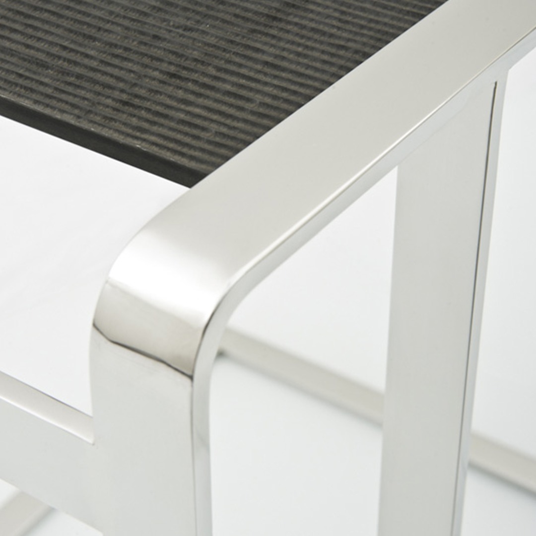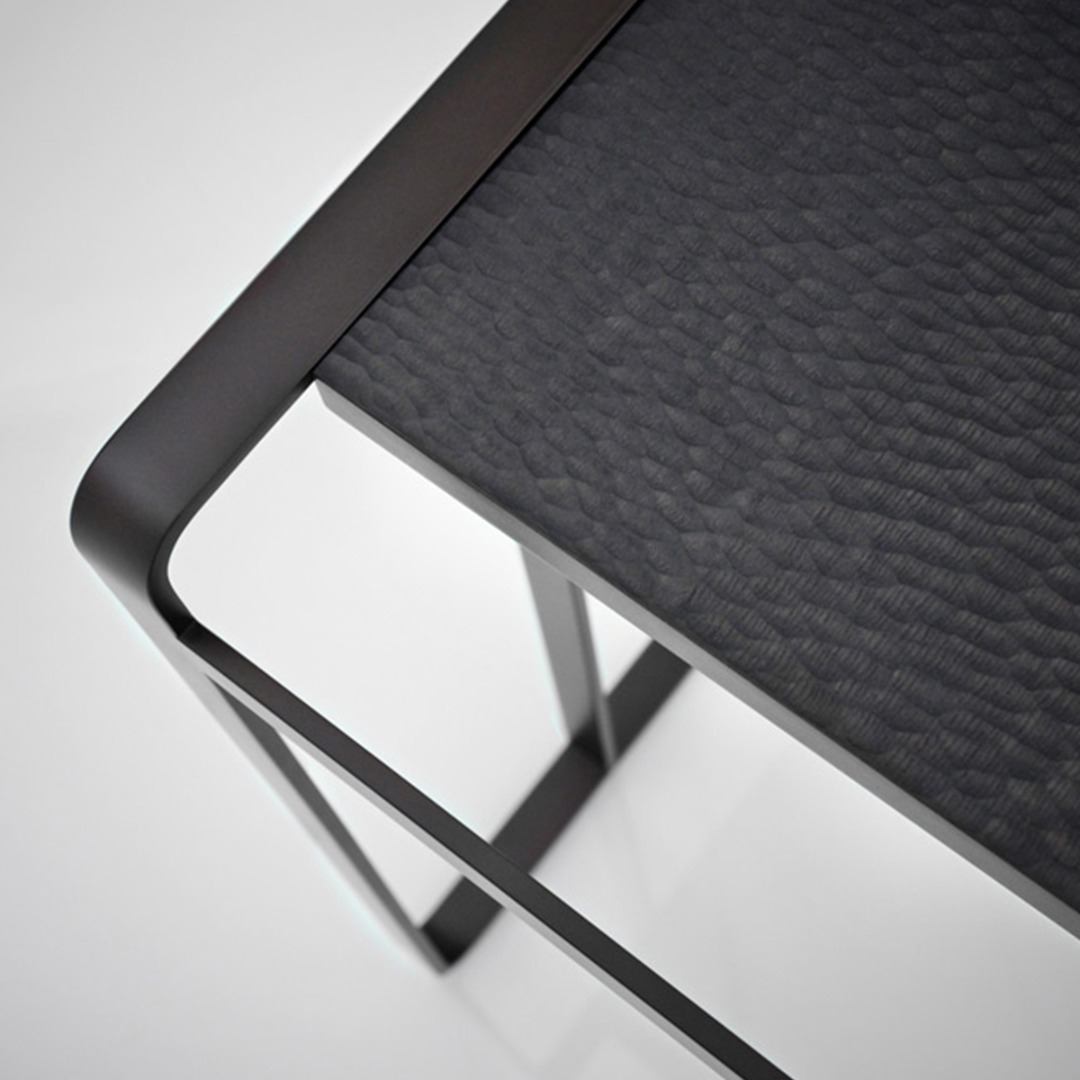 Table top finish, enquire for: bamboo, gouged maple veneer options. Stainless steel structural frame in: bronze, brushed, polished.