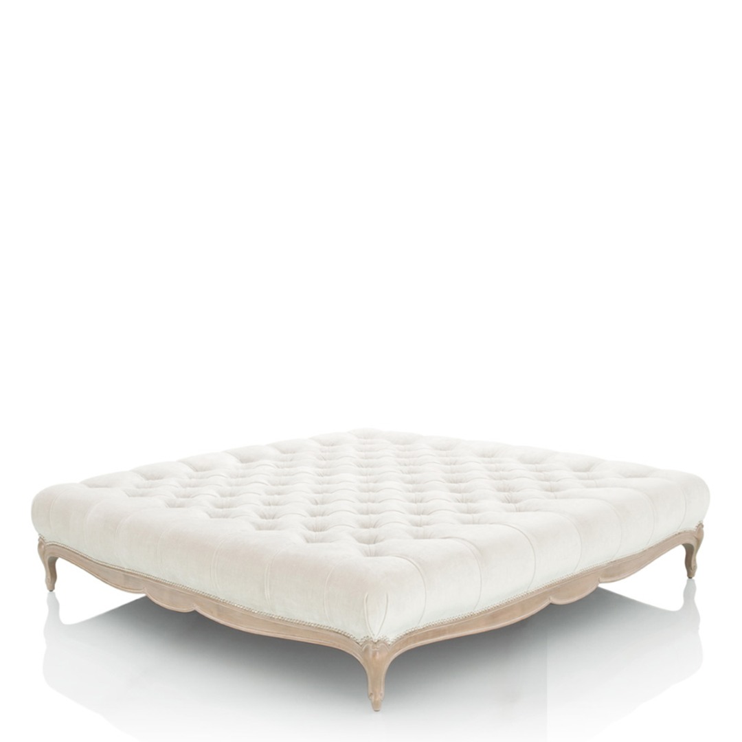 Large bench or footrest, square or rectangular, fully upholstered and buttoned.