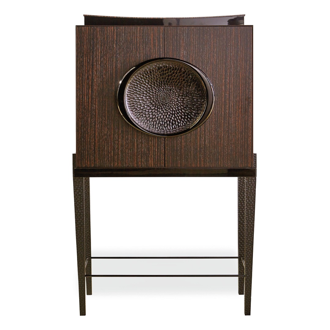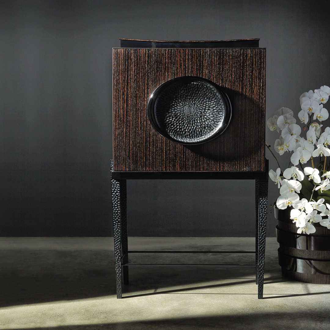 As shown: Top, bottom, outside of handle in Black Carl Lacquer (High Gloss). Kamakura-bori Matte legs. Doors and body in Brushed Paulownia. (3 drawers)