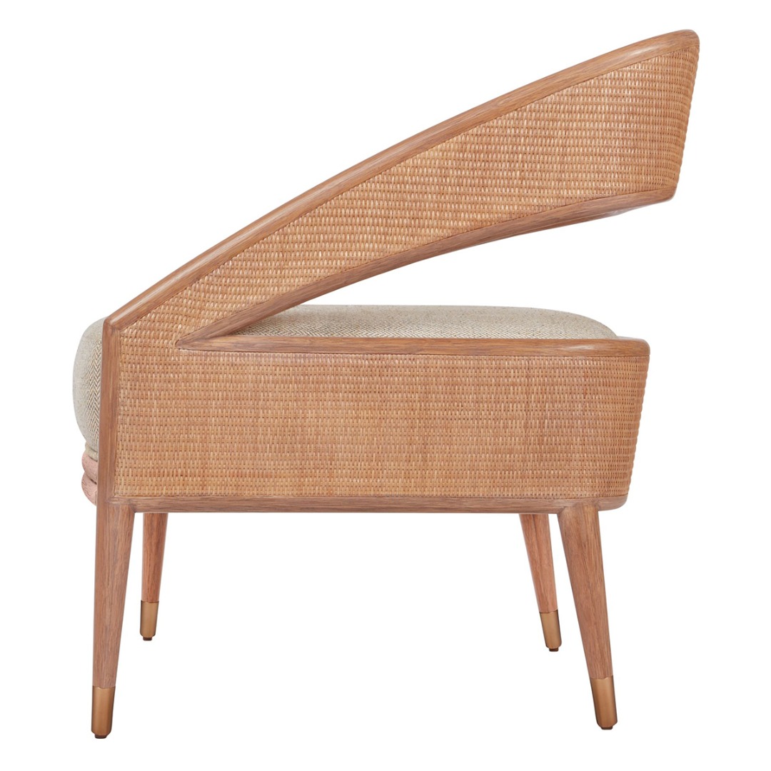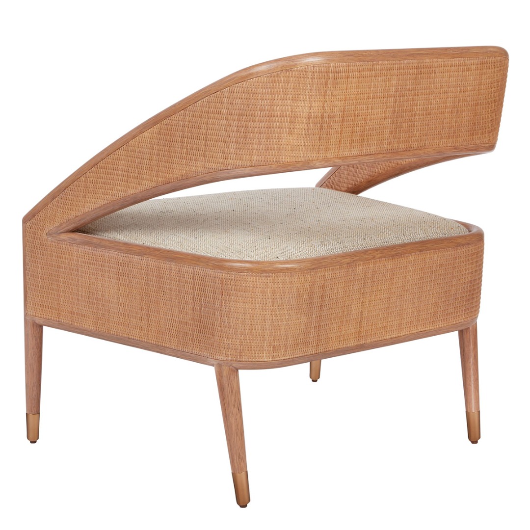 Rattan lounge chair with cantilevered back rest. Tight woven caning. Brass ferrules. Tight upholstered seat and inset back rest.