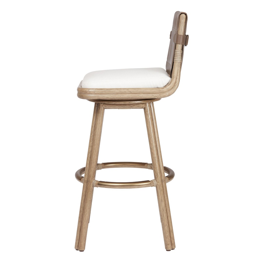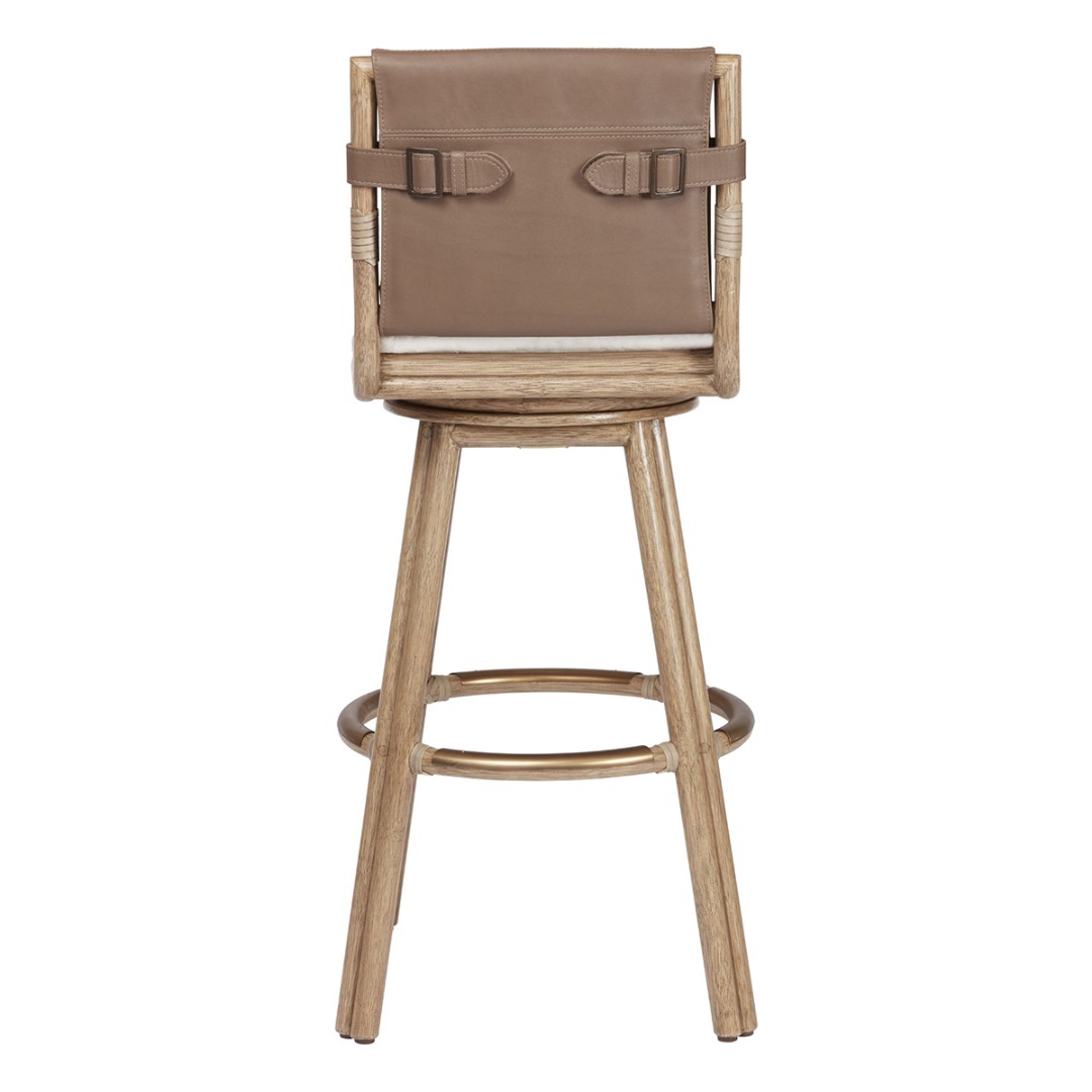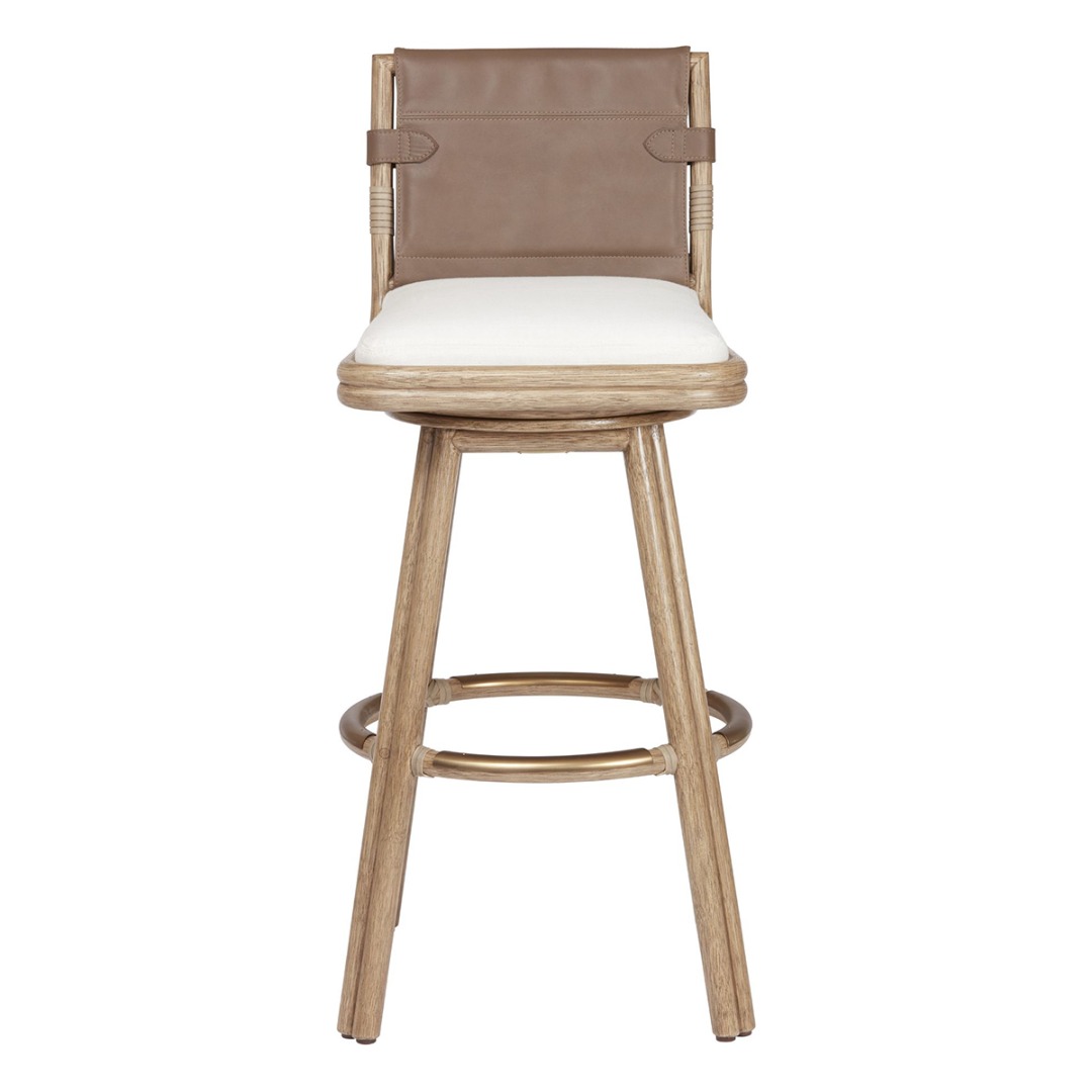 Finish shown: Sand Dune Finish, Pebble Leather Panels, Polished Brass foot rail, Lenno Ecru Fabric (No Longer Available).