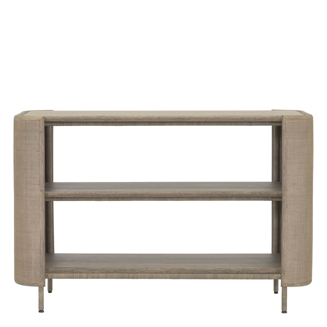 Low bookcase with curved caning sides, wood shelves and rattan trim. Rawhige wrapped steel frame.