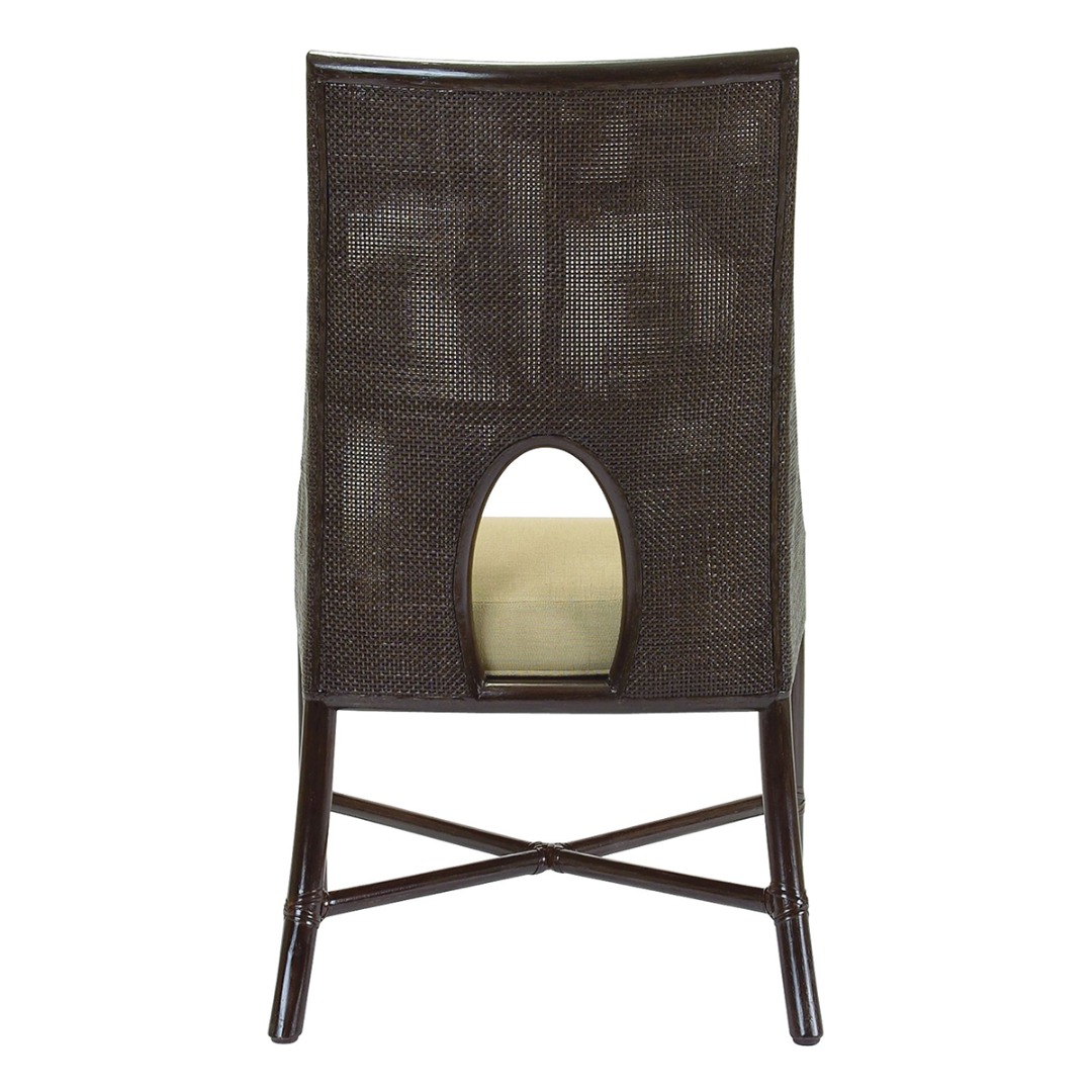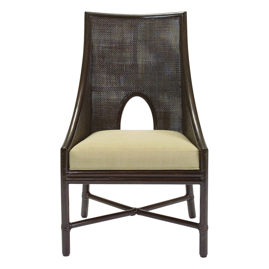 Rattan frame with square mesh caned arms and back. Tight upholstered seat with base welt.