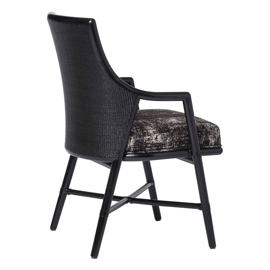 Rattan frame with cane webbing on back. Upholstered interior on back and seat. Attached seat cushion with welt along the base and inside back.