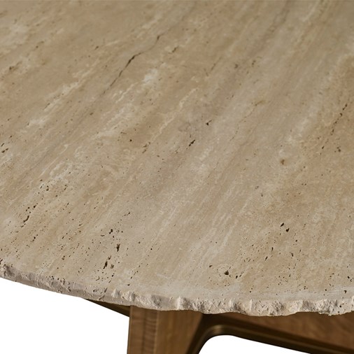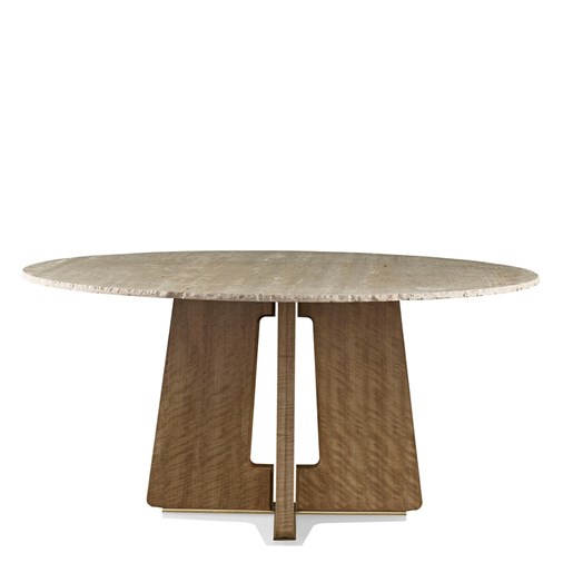 Base in quartered figured walnut. Top is 152cm(Ø) in either 19mm thick Starphire glass or travertine top. Metal details in warm bronze.