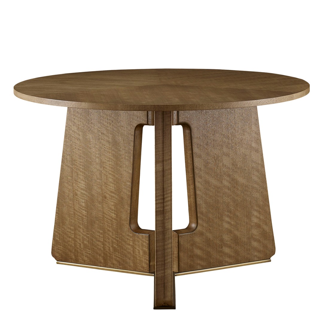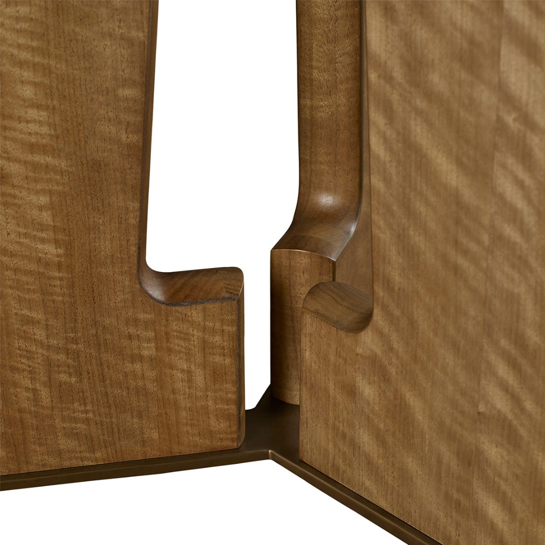 Table base in quartered figured walnut. Top options 19mm thick Natural Travertine with natural edging or quartered figured walnut top. Metal finish on the base in warm bronze.