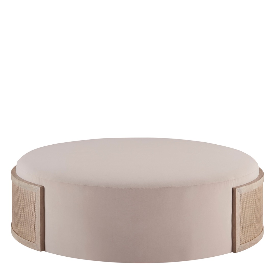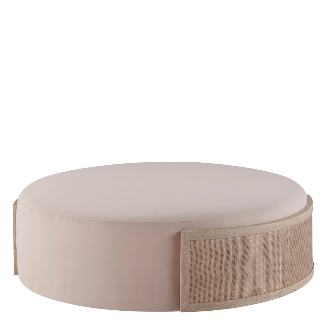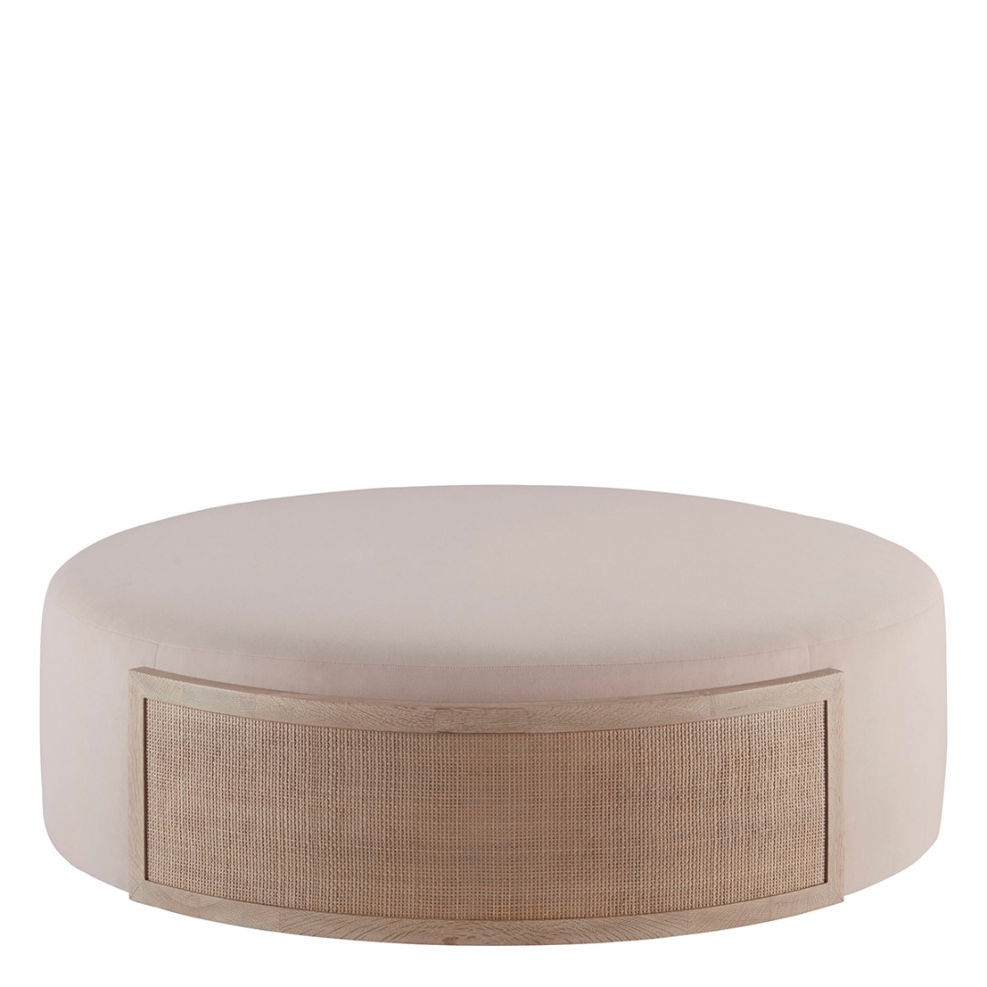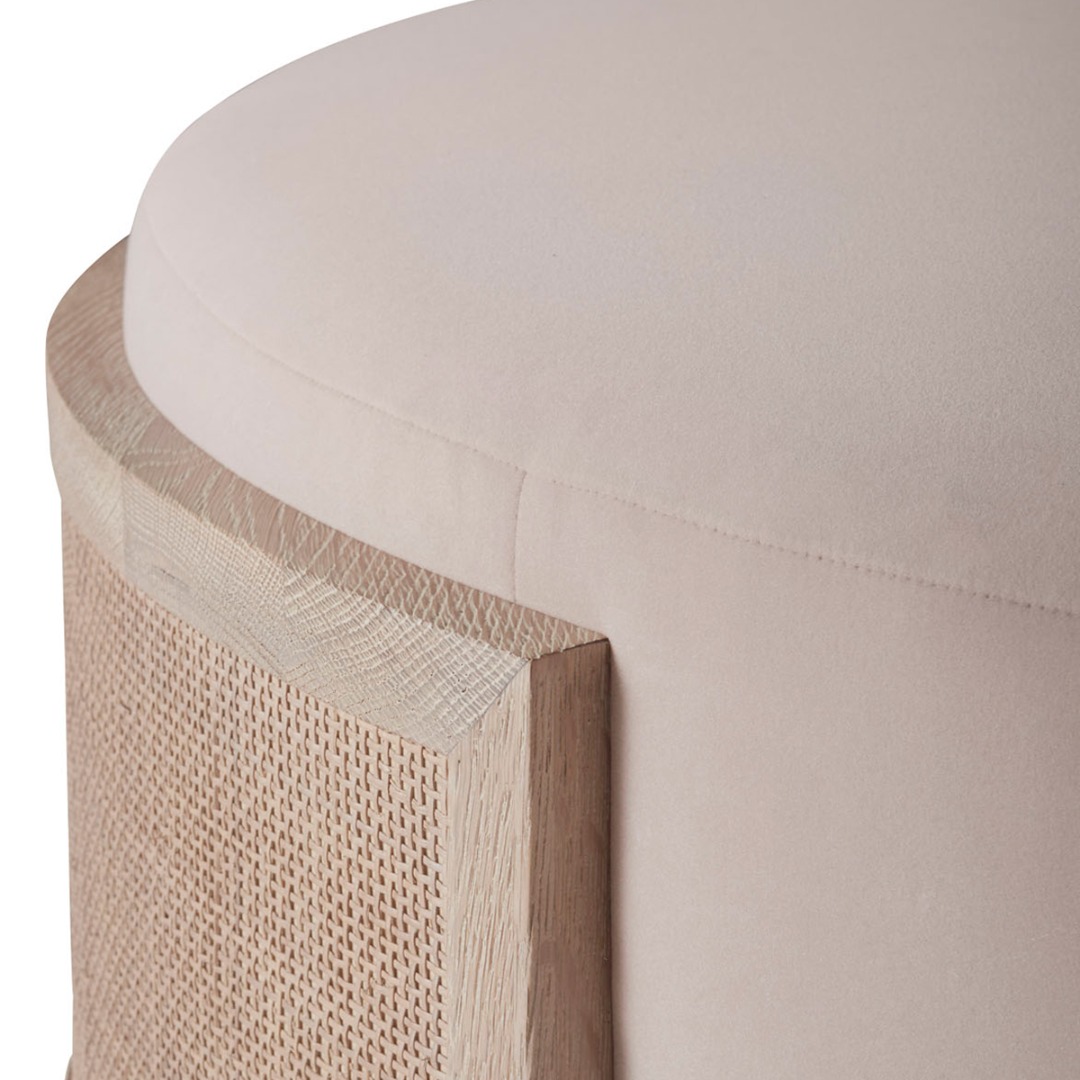Tight seat ottoman featuring oak solid and quartered oak veneer panels with square mesh caning.