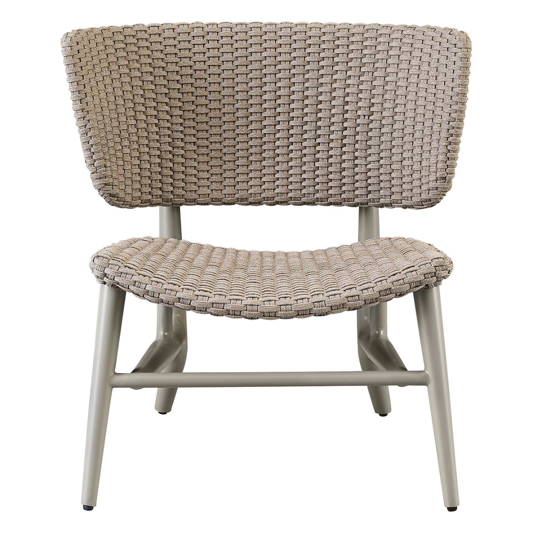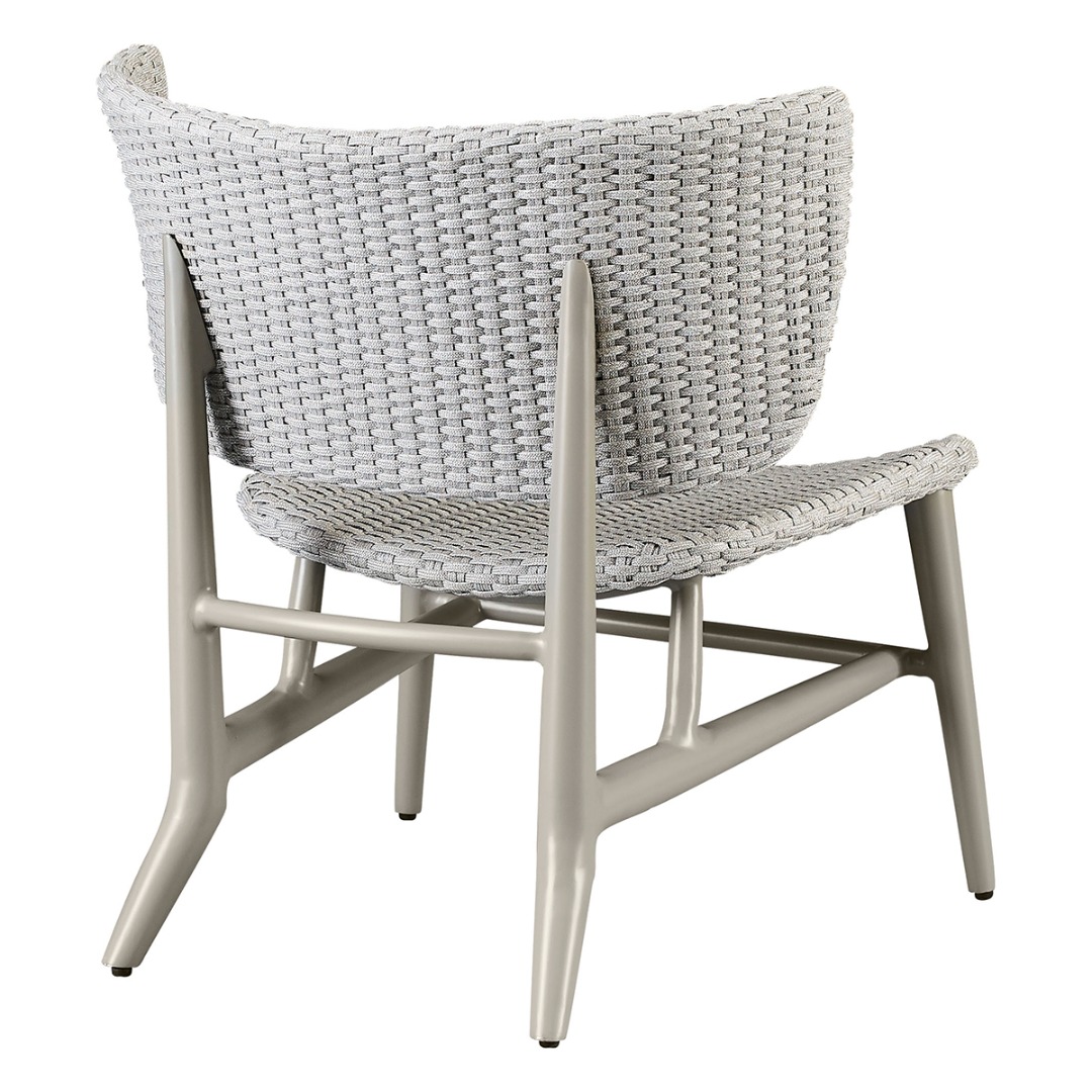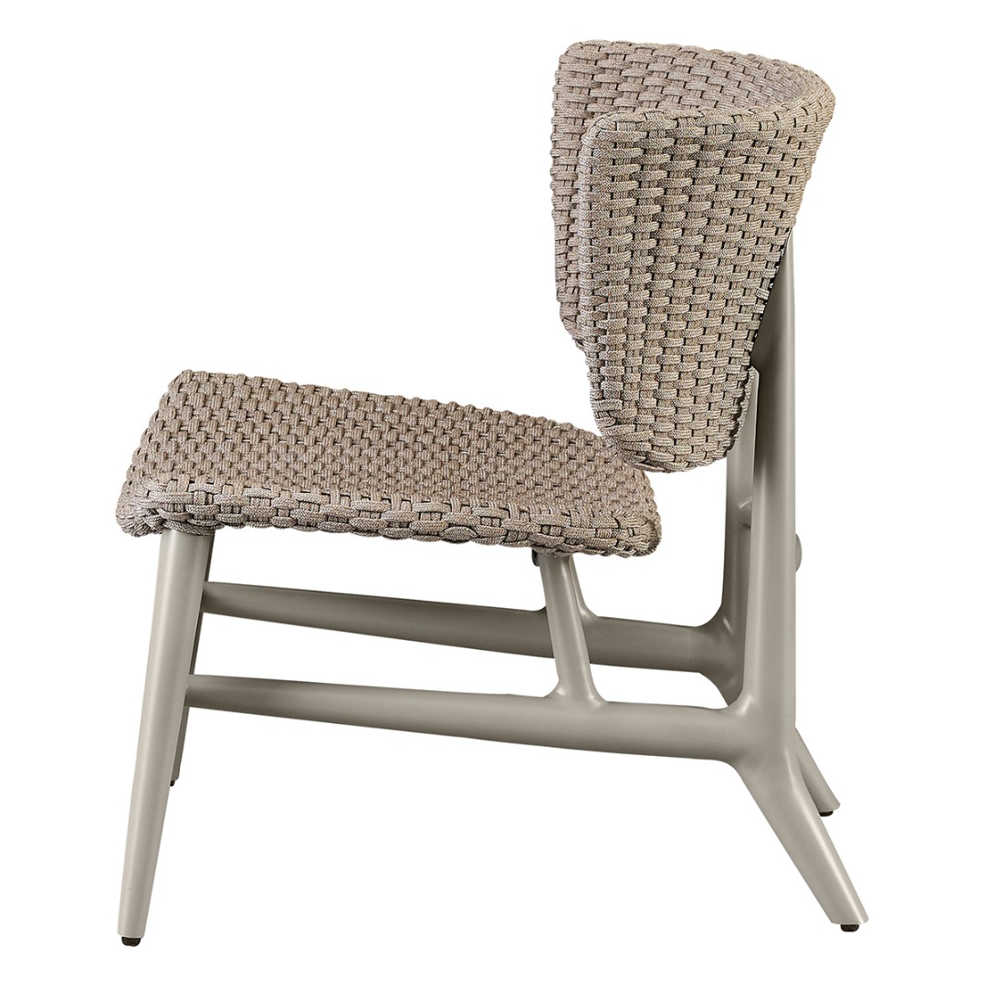 Cast aluminum lounge chair in Gravel finish with flat,woven acrylic rope in Stone or Bark.