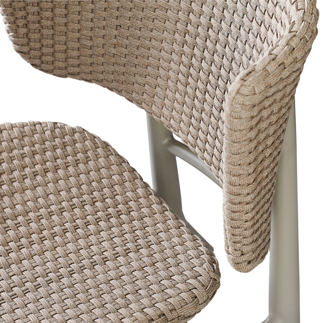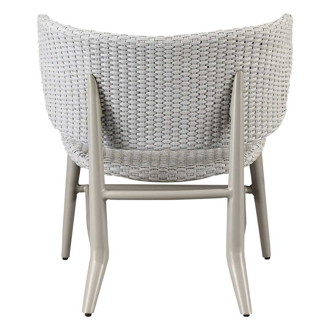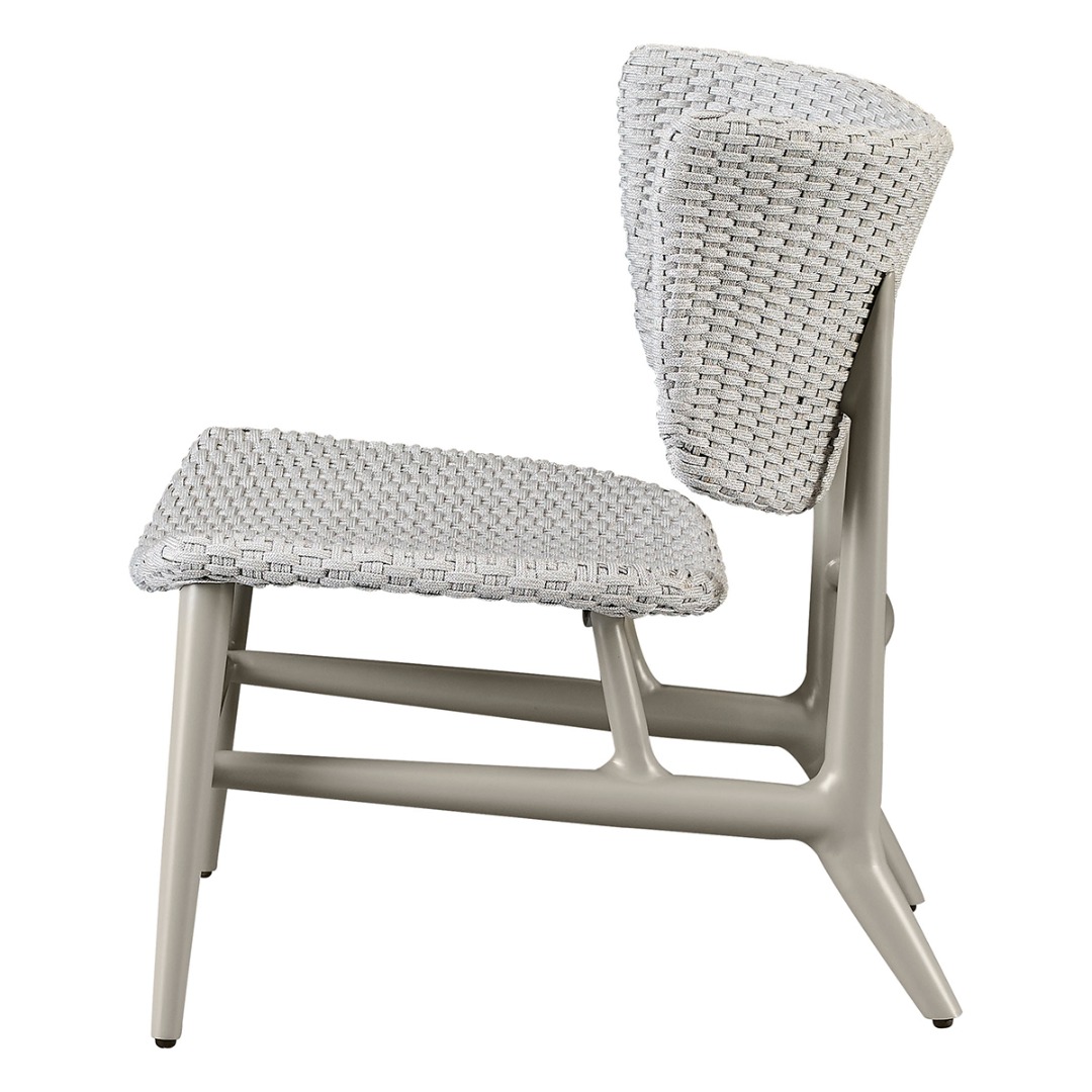 Cast aluminum lounge chair in Gravel finish with flat,woven acrylic rope in Stone or Bark.