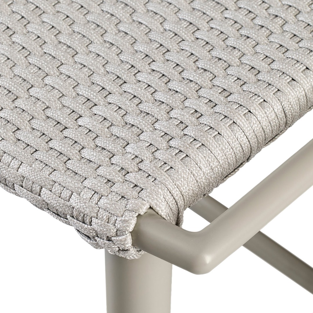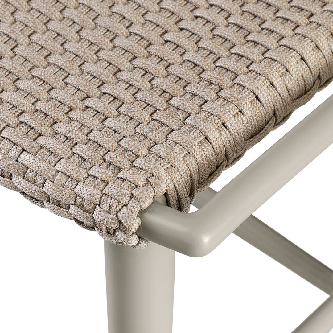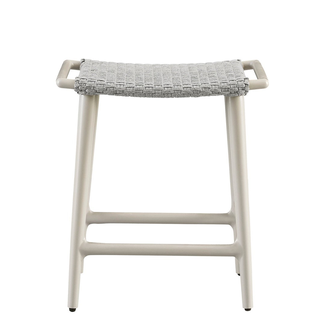 Cast aluminum counter stool in Gravel finish with flat,woven acrylic rope in Stone or Bark.