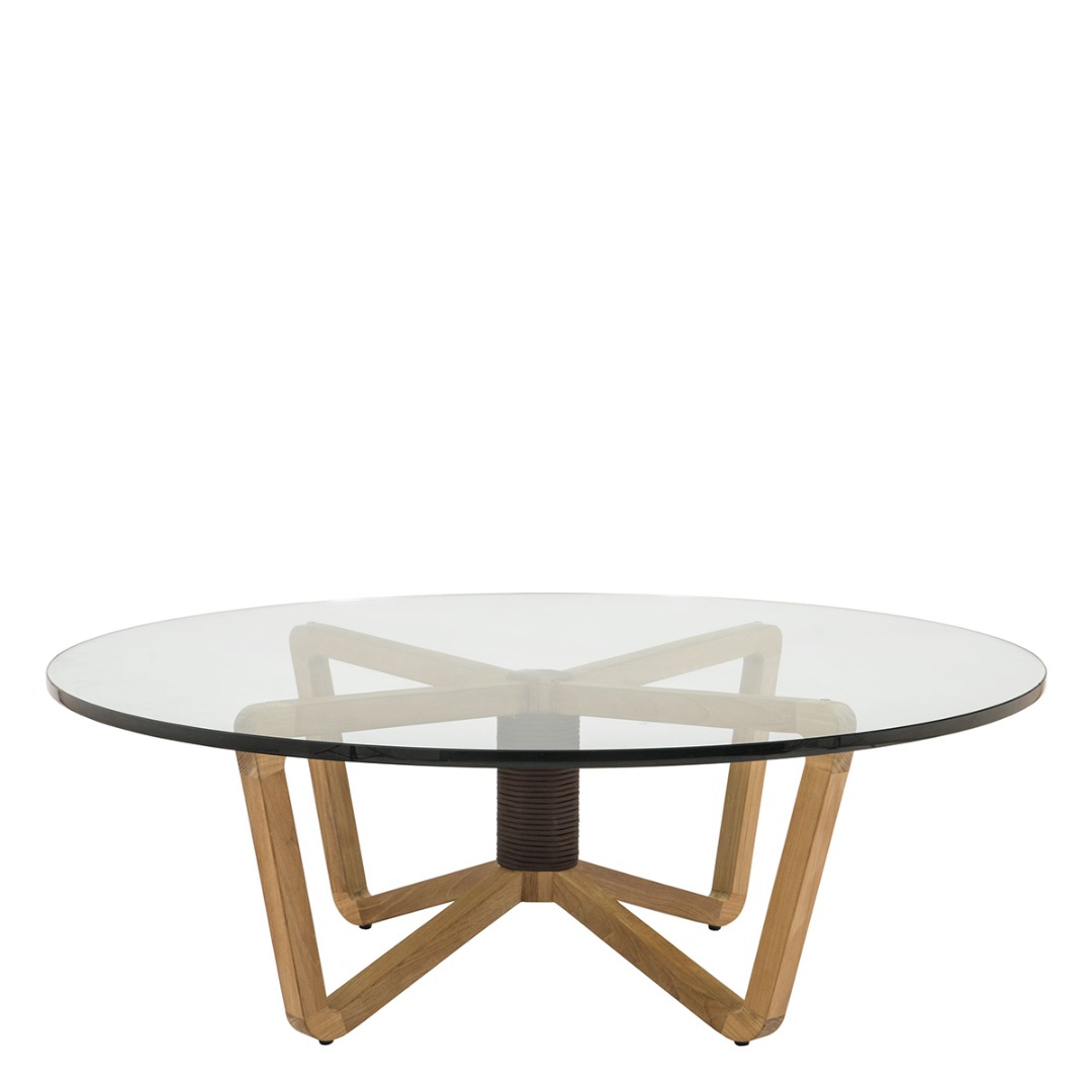 Natural teak base with dark brown resin rope detail. 122cm(Ø) glass top.