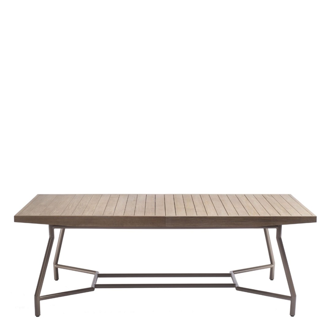 Teak with aluminium colour driftwood. Extends to 307cm long. Seats six without extension leaves and up to ten fully extended.