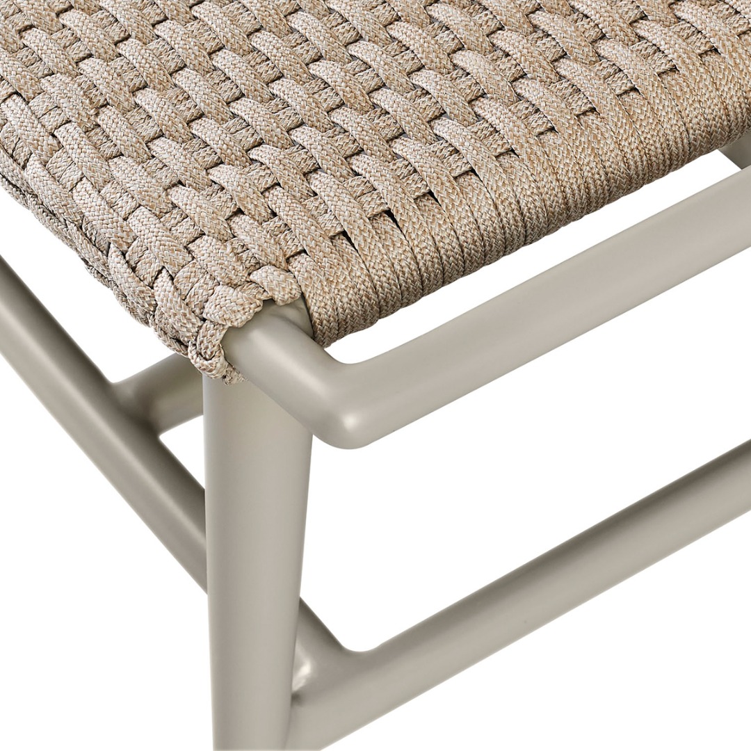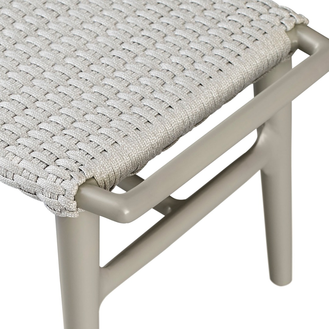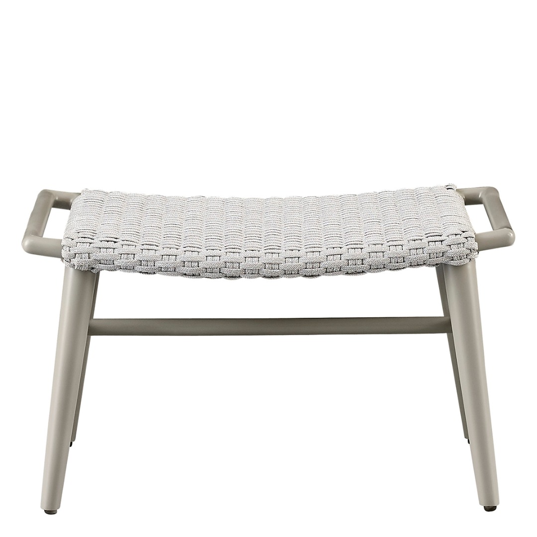 Cast aluminum ottoman in Gravel finish with flat woven acrylic rope in Stone or Bark.
