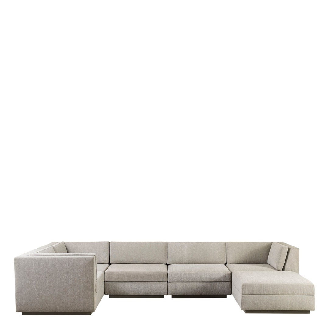 Modern low slipper chair with loose seat and back over a recessed aluminum plinth base.