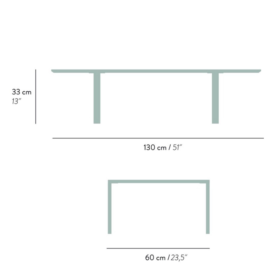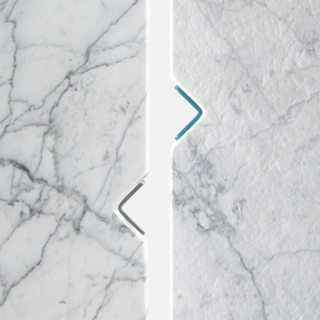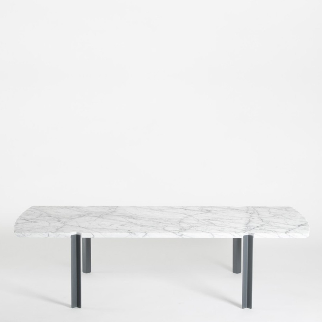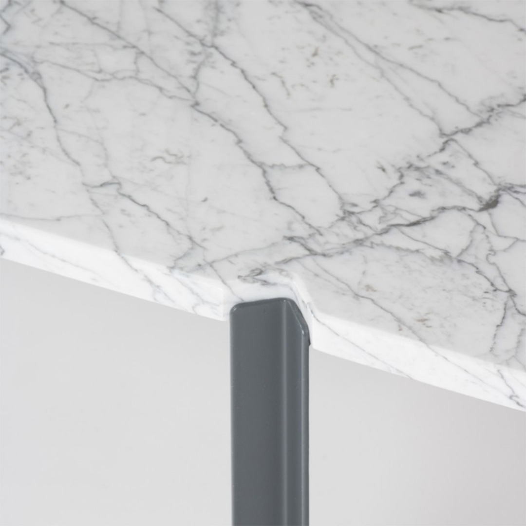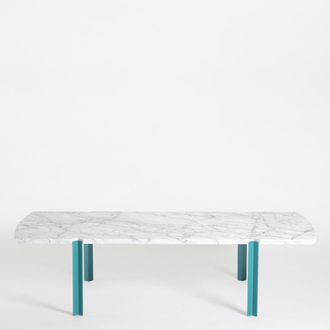 Powder coated steel frame finished in Grey or Turquoise. Top finished in Polished or matt brushed Bianco Fiorito marble.