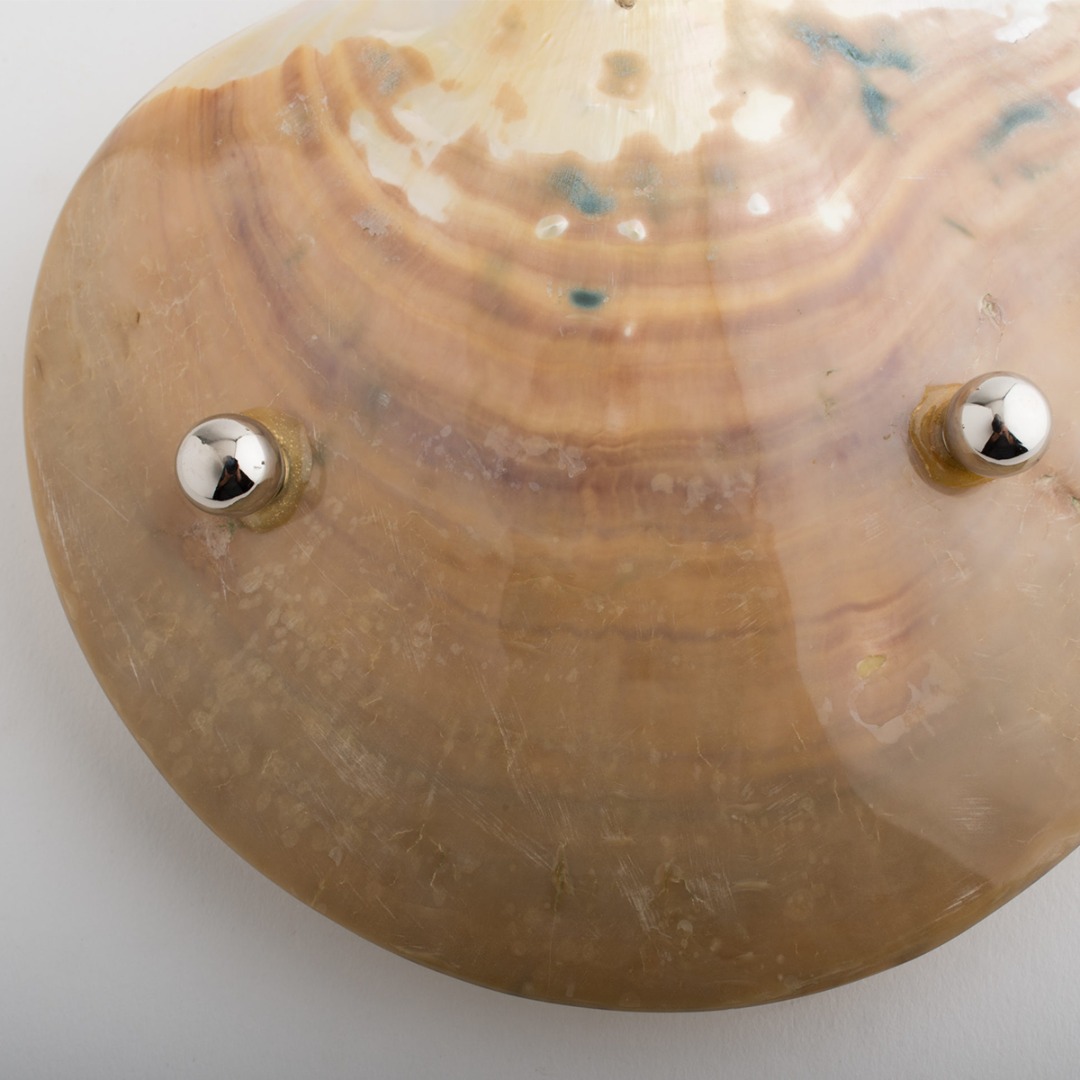 Cast in brass and then silver plated and fitted to a mother of pearl shell. The plate has silver plated ball feet.