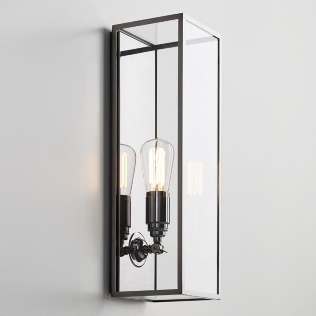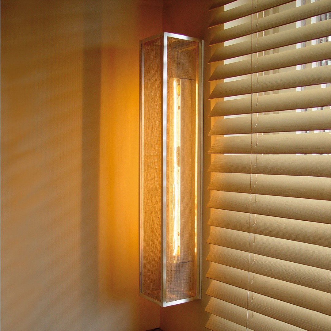 Wall light in brass with clear glass or metal gauze at the inside of the frame. Vertical installation.