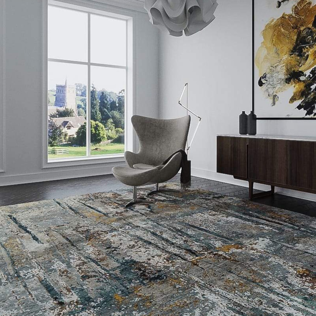 Abstract design finely illustrated in hand carded, hand spun Himalayan wool, linen, and silk. Luminance reveals an artfully reimagined use of color and texture, redolent of oxidized metal. Handcrafted with a Tibetan weave that features mixed piles of various colors and pile heights, an exemplary work of contemporary design.