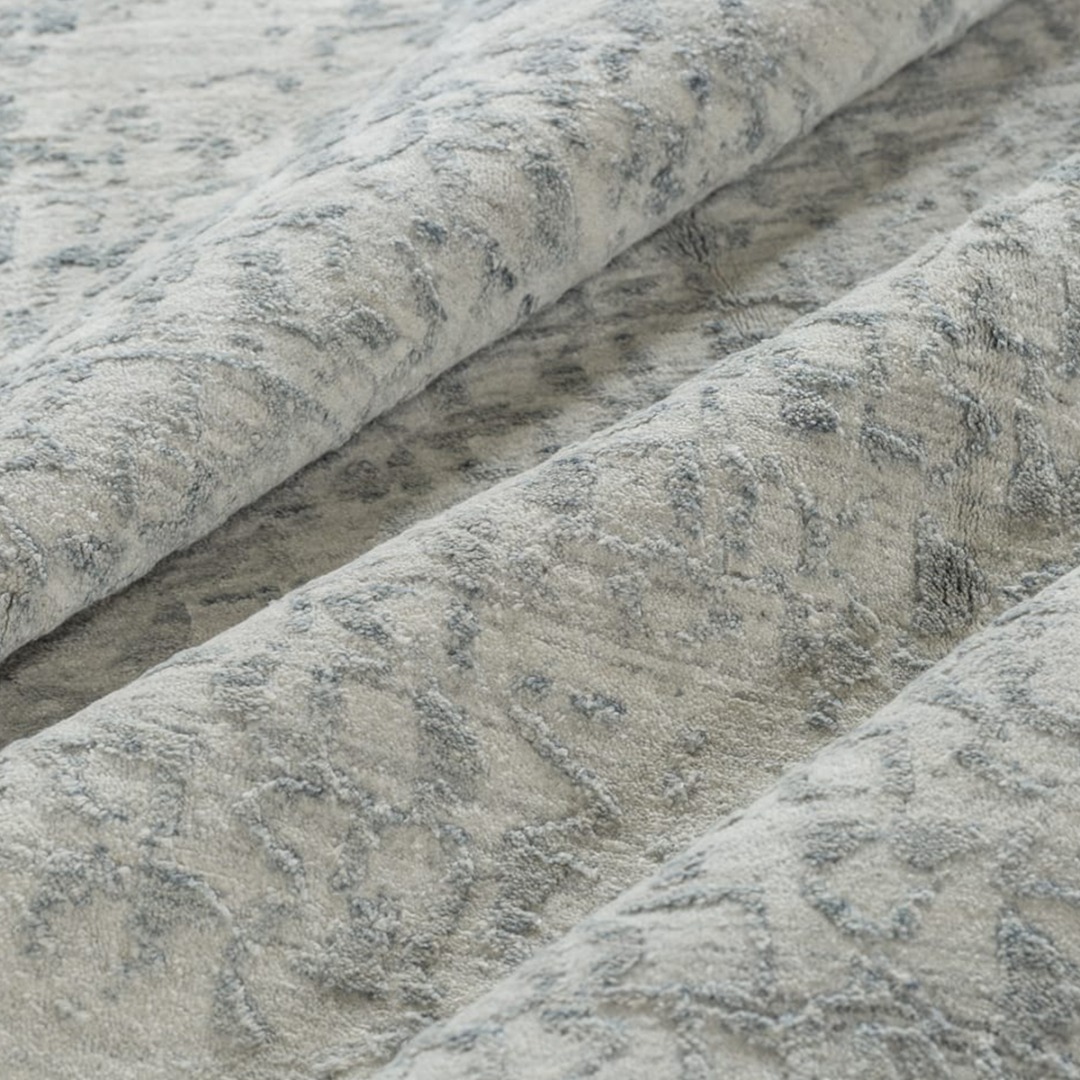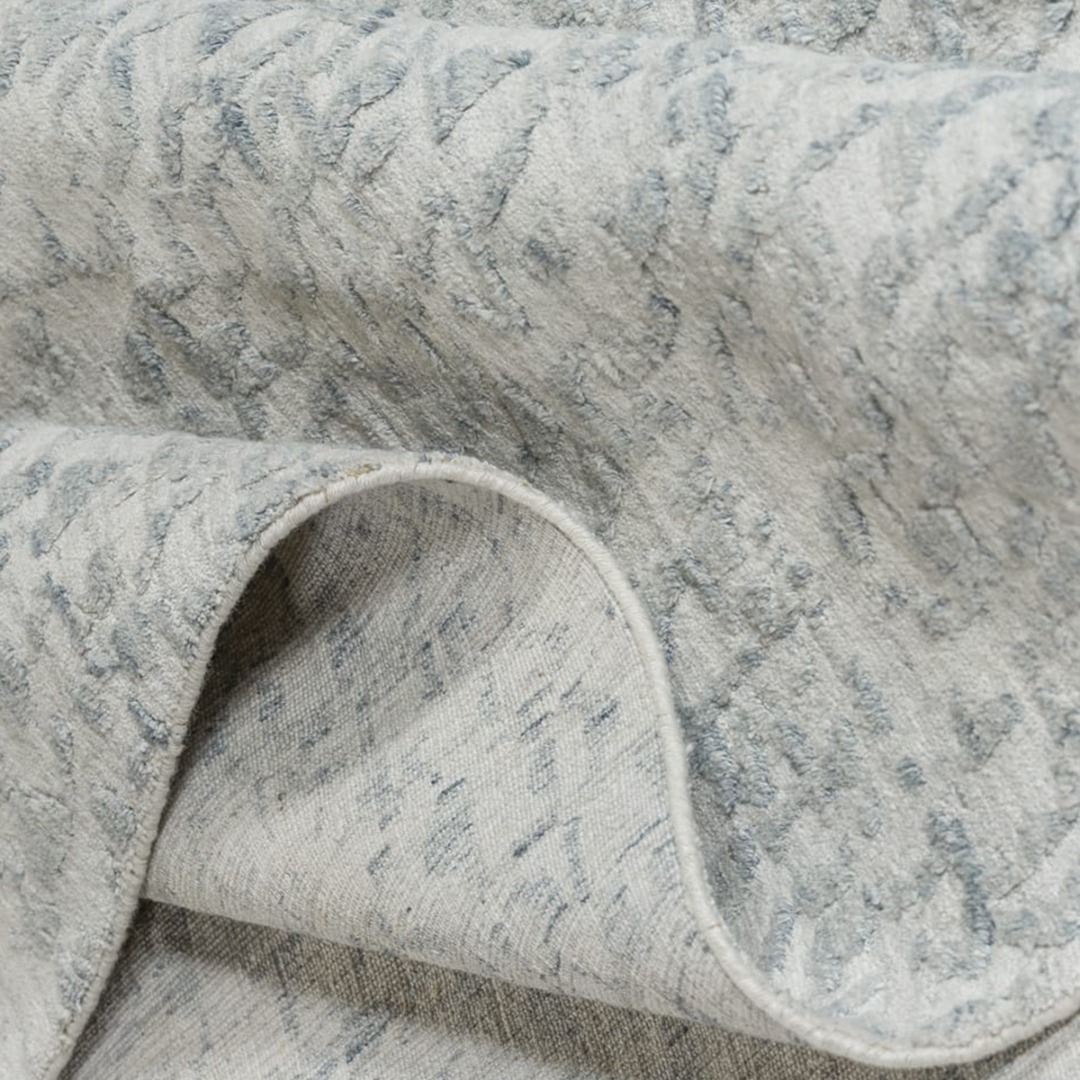 A charming carpet with a delicate unanticipated pattern offers an adaptable and grounding design for the floors. Graceful and cosmopolitan, the combination of whites and grey blue hues give this carpet a light airy movement. Tufenkian's handloom process allows for beautiful small details not possible with hand knotting, demonstrated beautifully here in the small scale pattern of Rune.