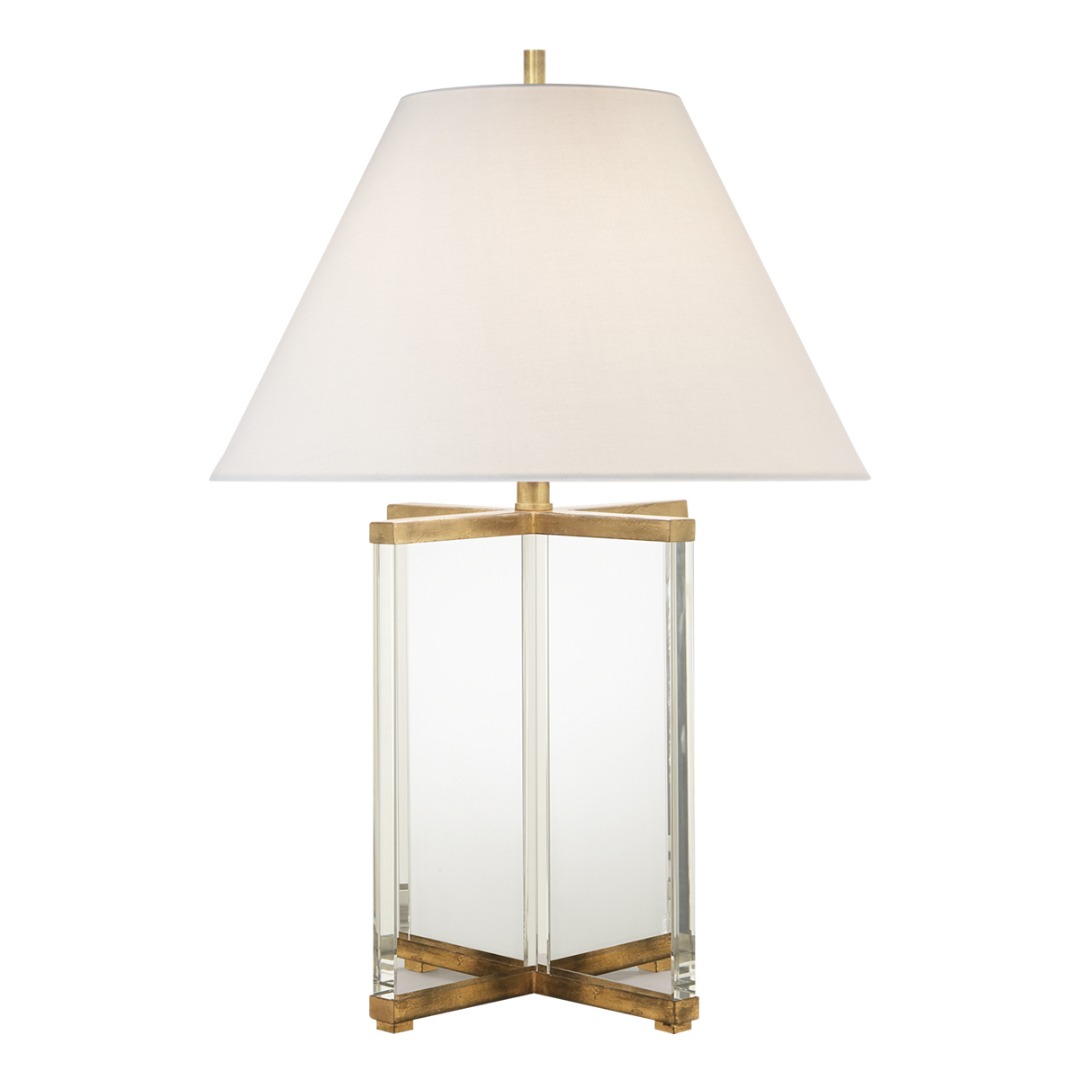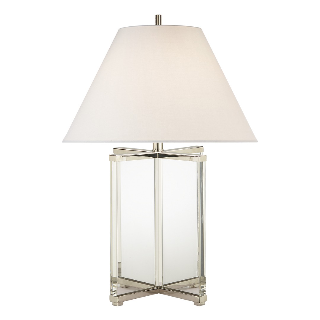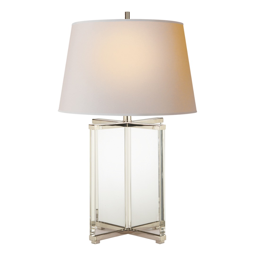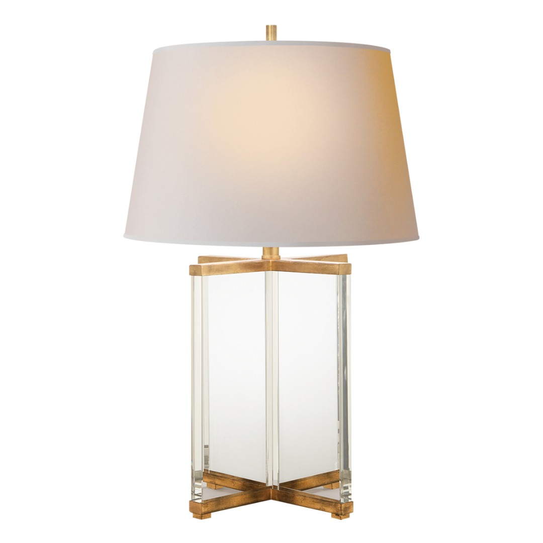 Table Lamp available in Crystal and Polished Nickel, Crystal and Gilded Iron, Quartz and Burnished Silver Leaf, or Quartz and Gilded Iron. Linen shade.